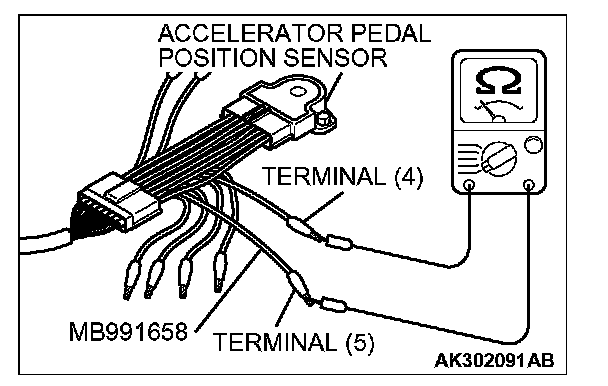 3. Connect the ohm meter between terminal No. 4 and No. 5 of the accelerator pedal position sensor.