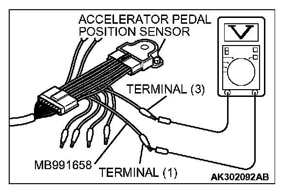 9. Connect the digital voltmeter between terminal No. 3 [accelerator pedal position sensor (main) output] and terminal No. 1 [accelerator pedal position sensor (main) earth].
