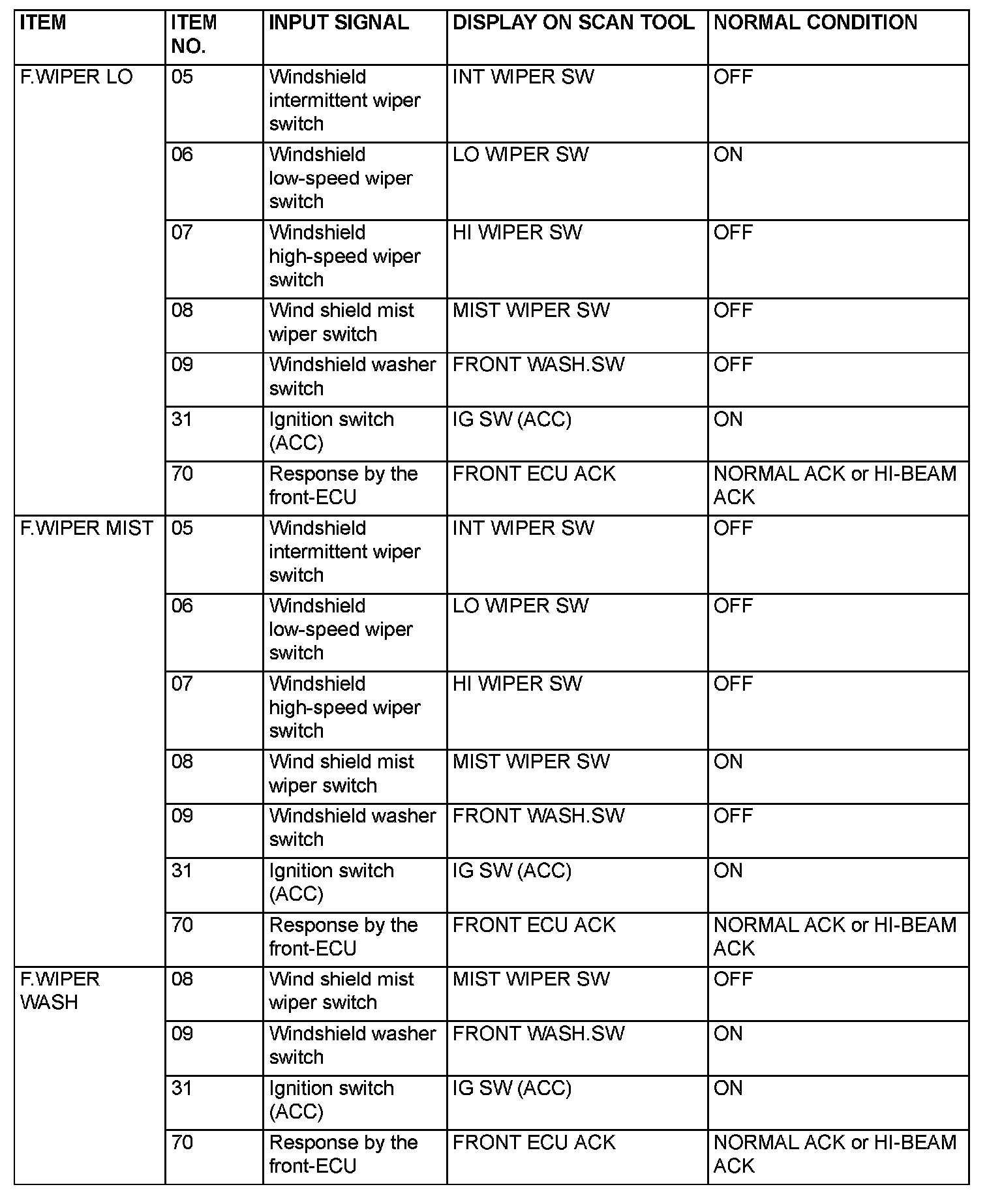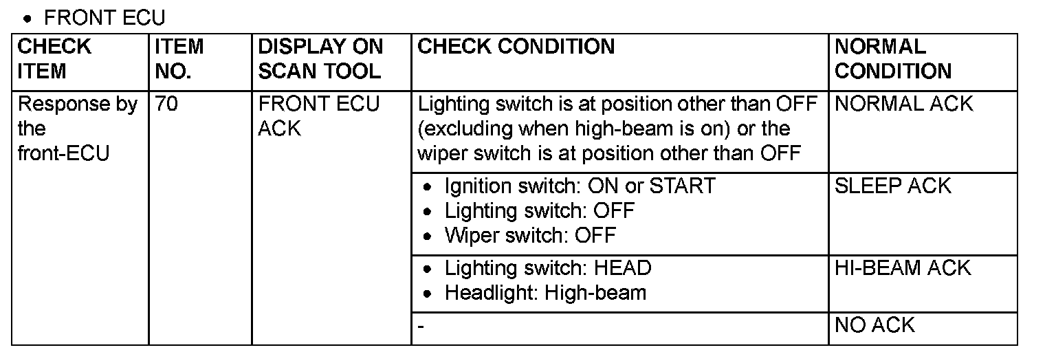 NOTE: For item number 70, the scan tool also displays "NG" under the "ECU COMM CHK" when it displays "NO ACK" under the front-ECU check.