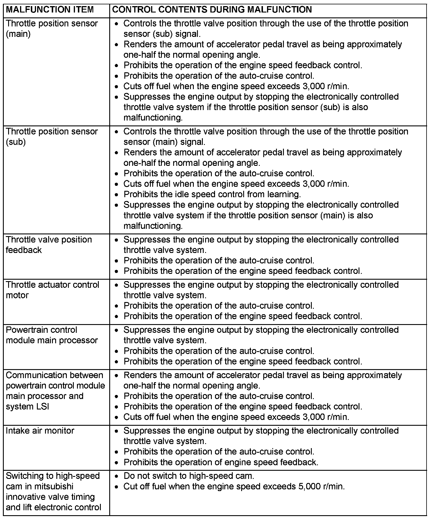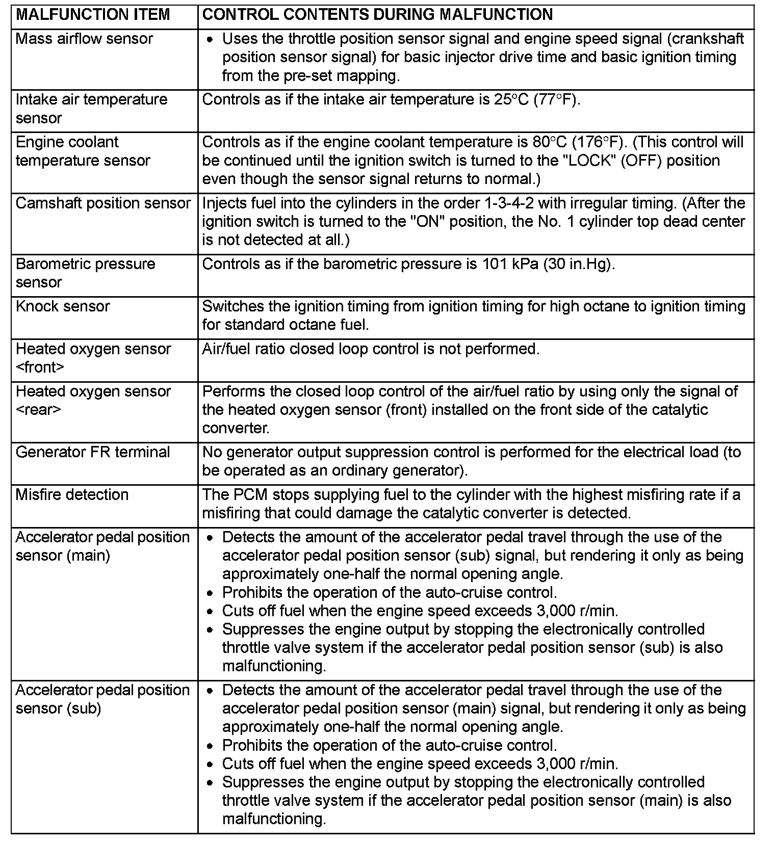 When the main sensor malfunctions are detected by the diagnostic test mode, the vehicle is controlled by means of the following defaults.