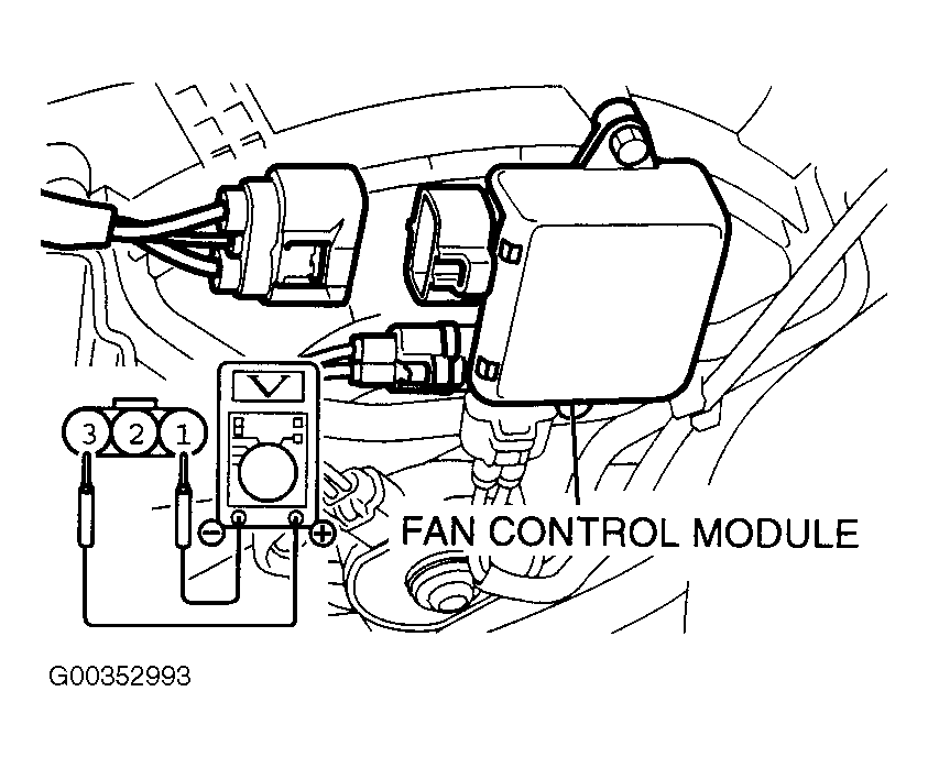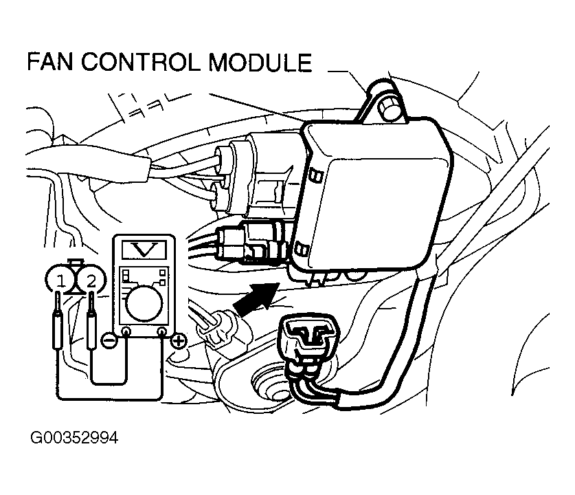 - Measure voltage between the fan control module (side connector) terminals. Voltage should be one volt or less.