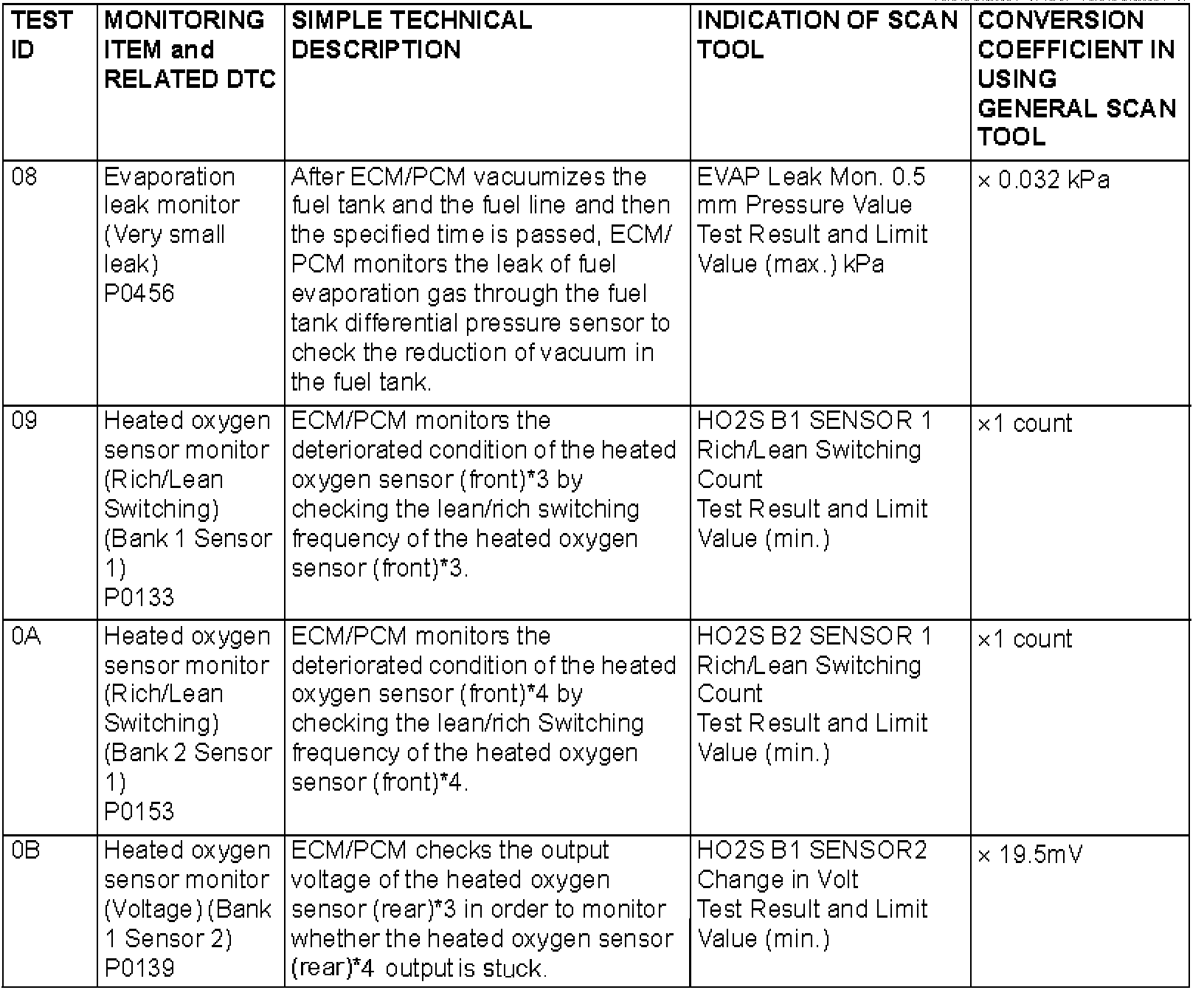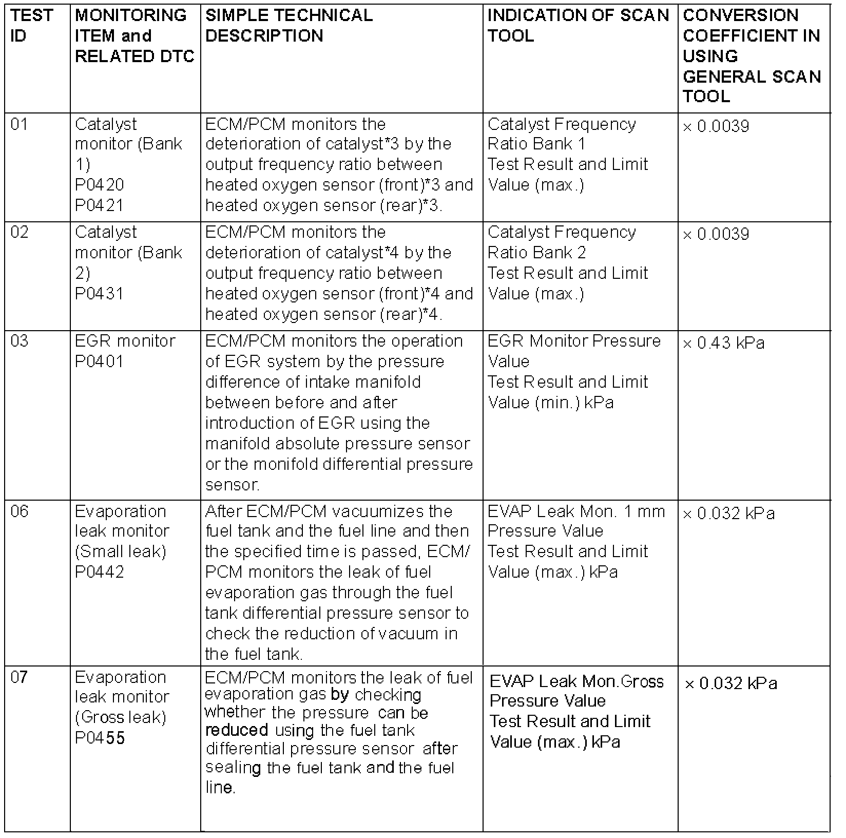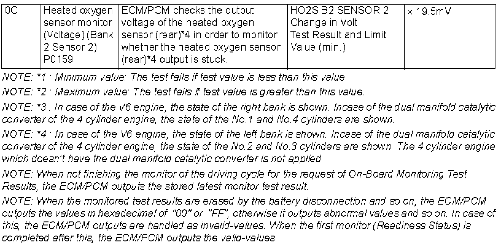 NOTE: By selecting MODE 06 using a scan tool, Test Result and Limit Value minimum (*1) or maximum (*2) about the main items of the emission control system, which the ECM/PCM monitors, can be confirmed. The value at the last monitoring is output by ECM/PCM as a test result.