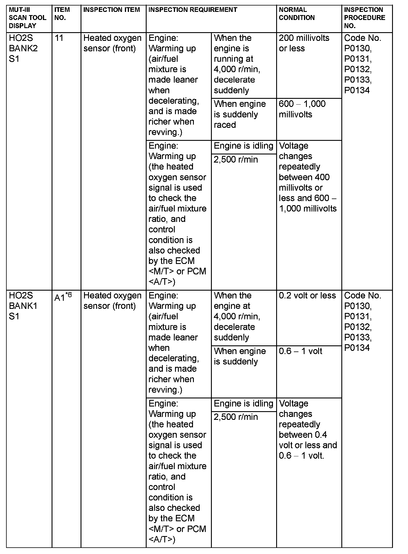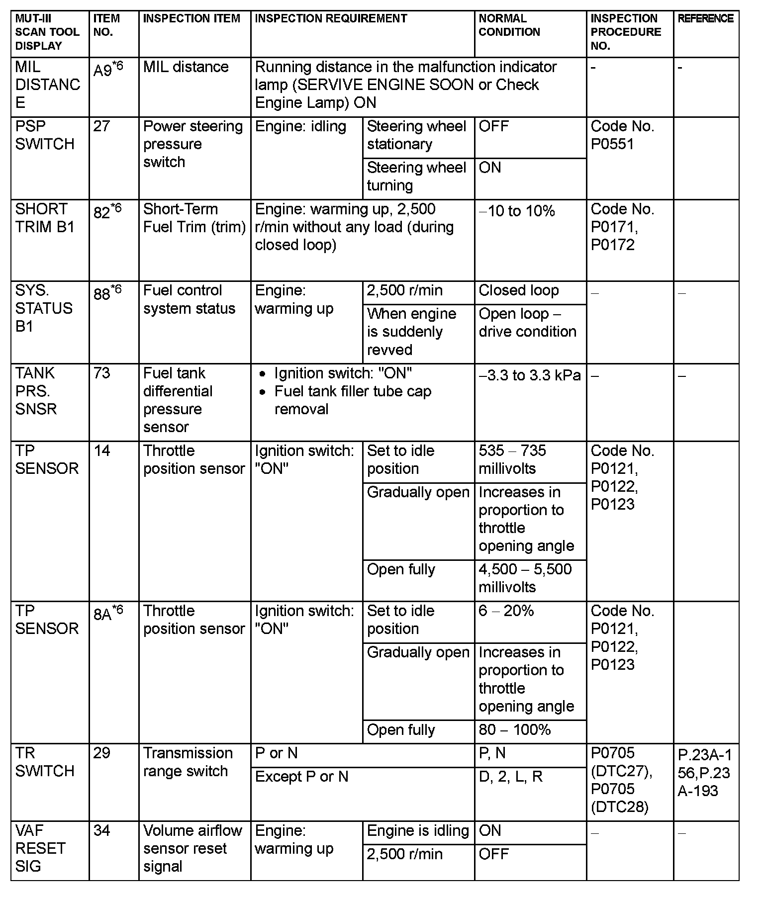 *6: GST items. [Data list items consist of MUT-III items and GST items. GST items can be accessed through the use of a general scan tool (GST). When scan tool MB991958 (MUT-III sub assembly) is used, MUT-III items appear alphabetically; then, GST items appear alphabetically. The black and white characters of the GST items are inverted from the MUT-III items.]