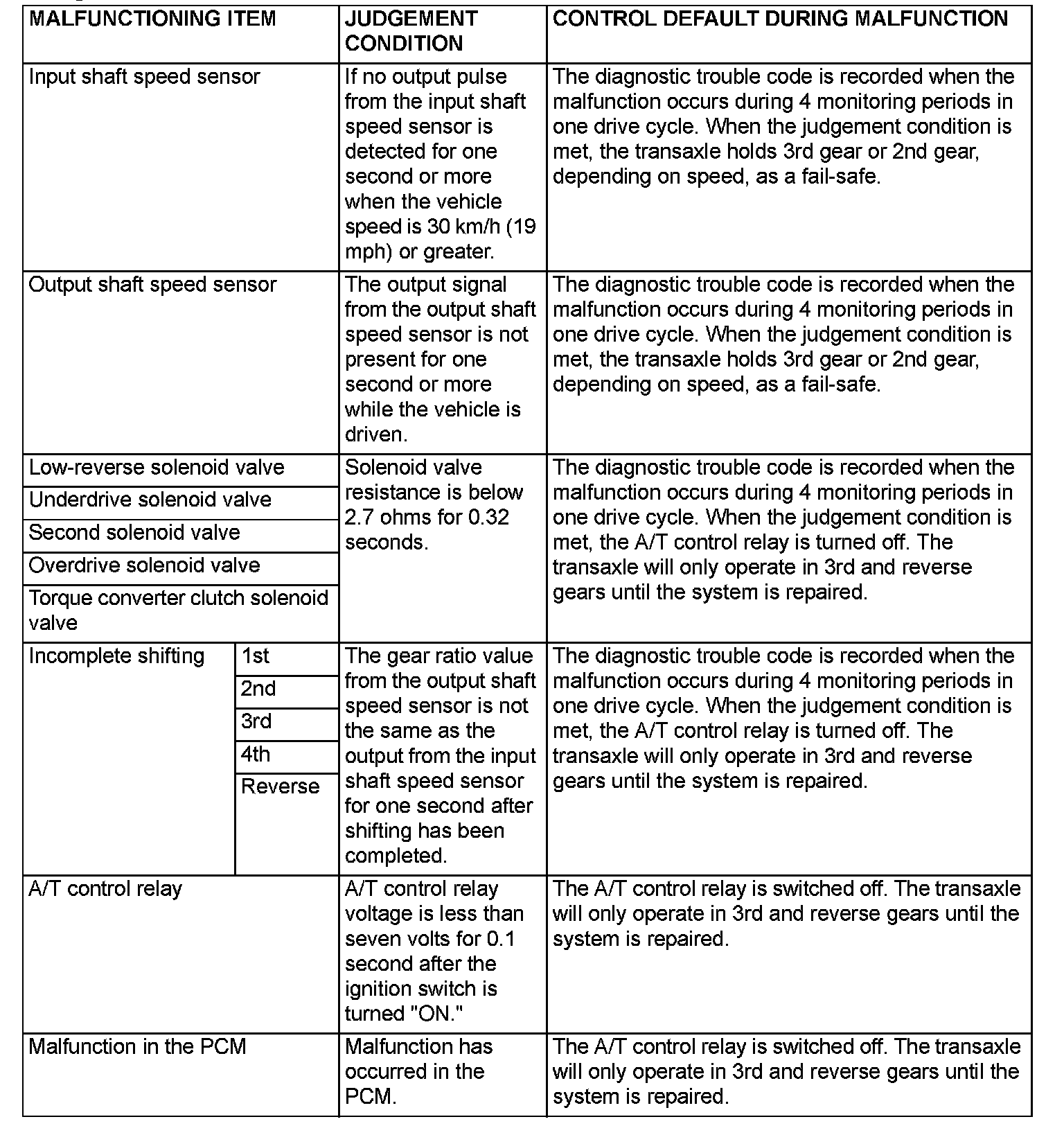 FAIL-SAFE/BACKUP FUNCTIONWhen a malfunction of a main sensor or actuator is detected by the PCM, the transaxle is controlled by pre-set control logic to maintain safe conditions for driving.