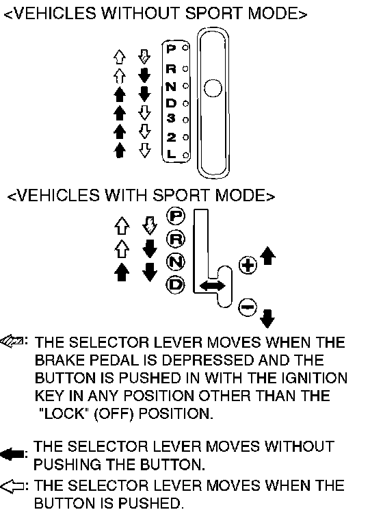 NOTE: The A/T mis-operation prevention mechanism prevents movement of the selector lever from the "P" position if the ignition switch is in a position other than "LOCK" (OFF) and the brake pedal is not depressed.