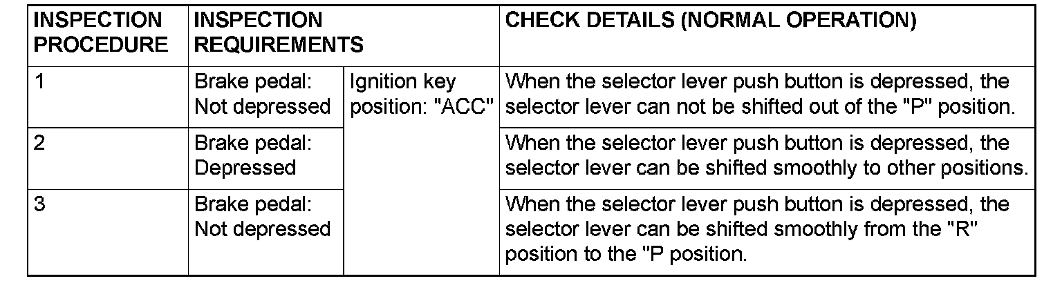 SHIFT LOCK MECHANISM CHECK1. Perform the following inspections.