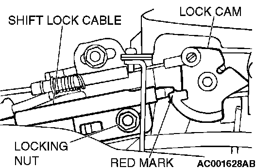 4. Adjust the cable so that the end of the shift lock cable is above the red line on the lock cam and tighten the locking nut.