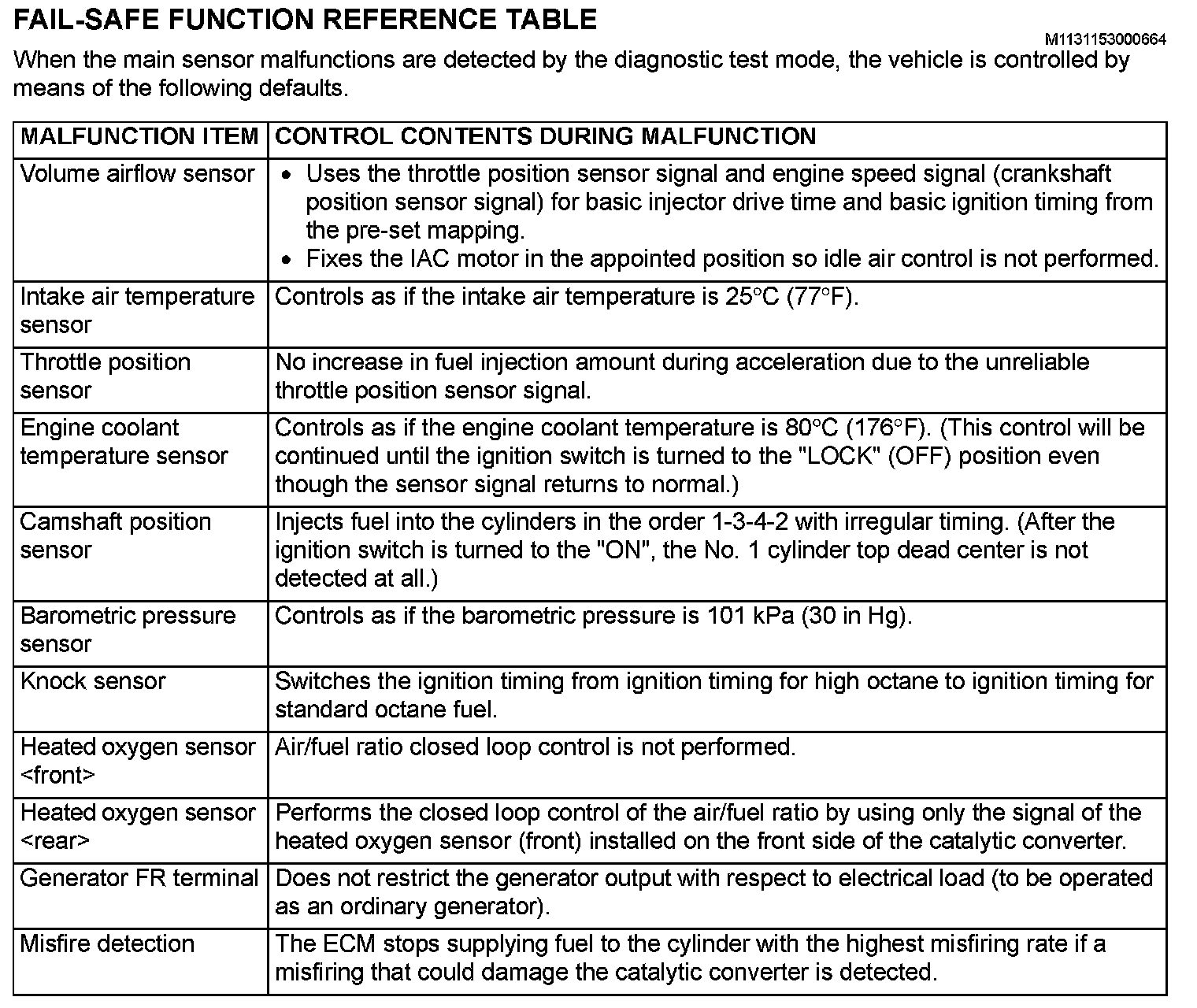 When the main sensor malfunctions are detected by the diagnostic test mode, the vehicle is controlled by means of the shown defaults.