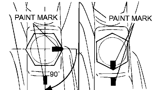 Make a paint mark on the bearing cap at the position 90 degree angle from the paint mark made on the bolt in the direction of tightening the bolt.