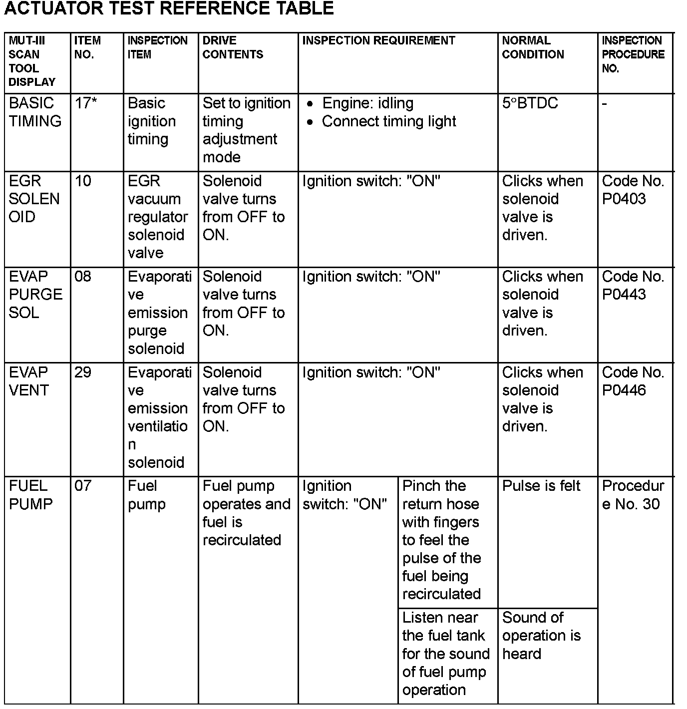 Actuator Test Reference Table