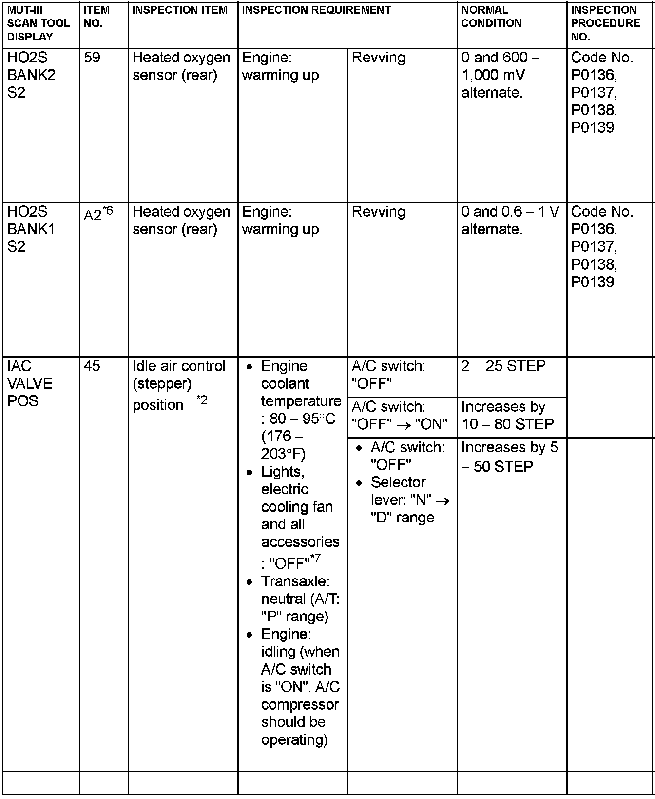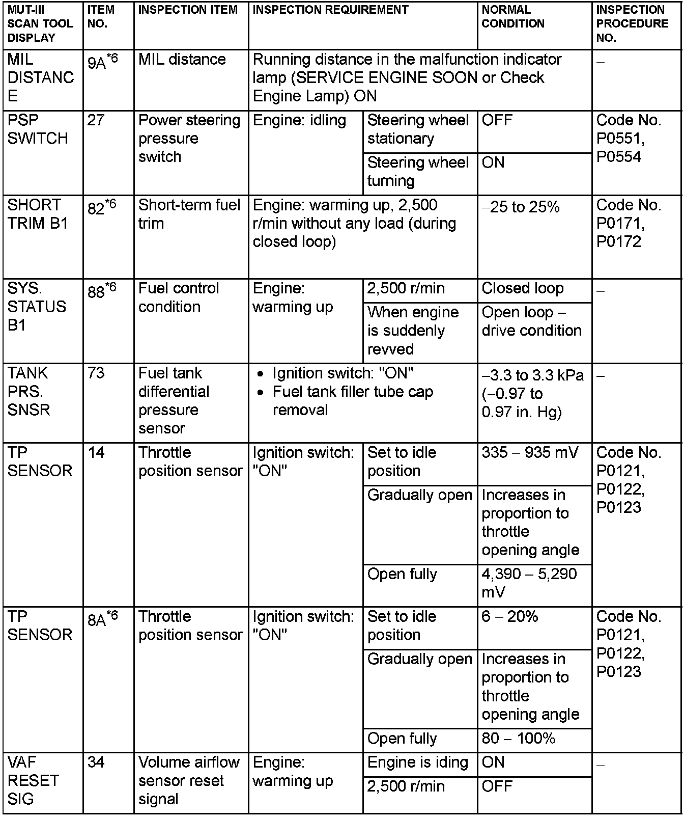 NOTE: *6: GST items. [Data list items consist of MUT-III items and GST items. GST items can be accessed through the use of a general scan tool (GST). When scan tool MB991958 (MUT-III sub assembly) is used, MUT-III items appear alphabetically; then, GST items appear alphabetically. The black and white characters of the GST items are inverted from the MUT-III items.]