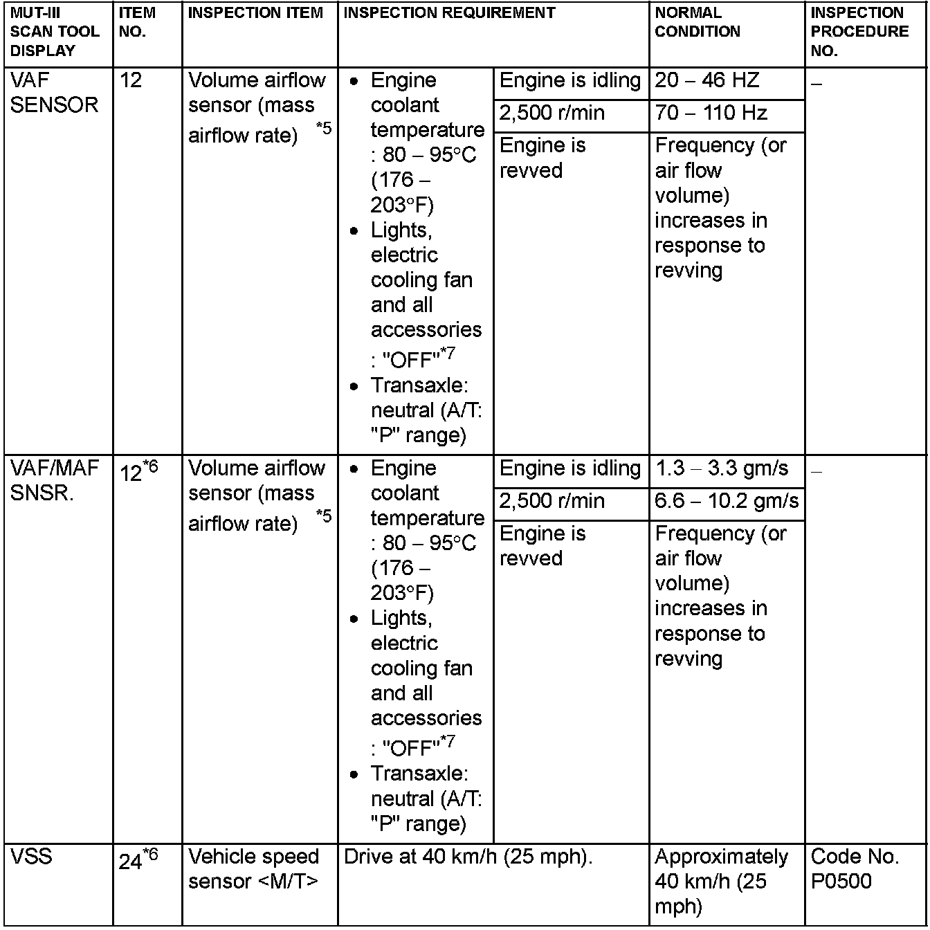 NOTE: *5: In a new vehicle [driven approximately 500 km (311 mile) or less], the volume airflow sensor output frequency is sometimes 10% higher than the standard frequency.