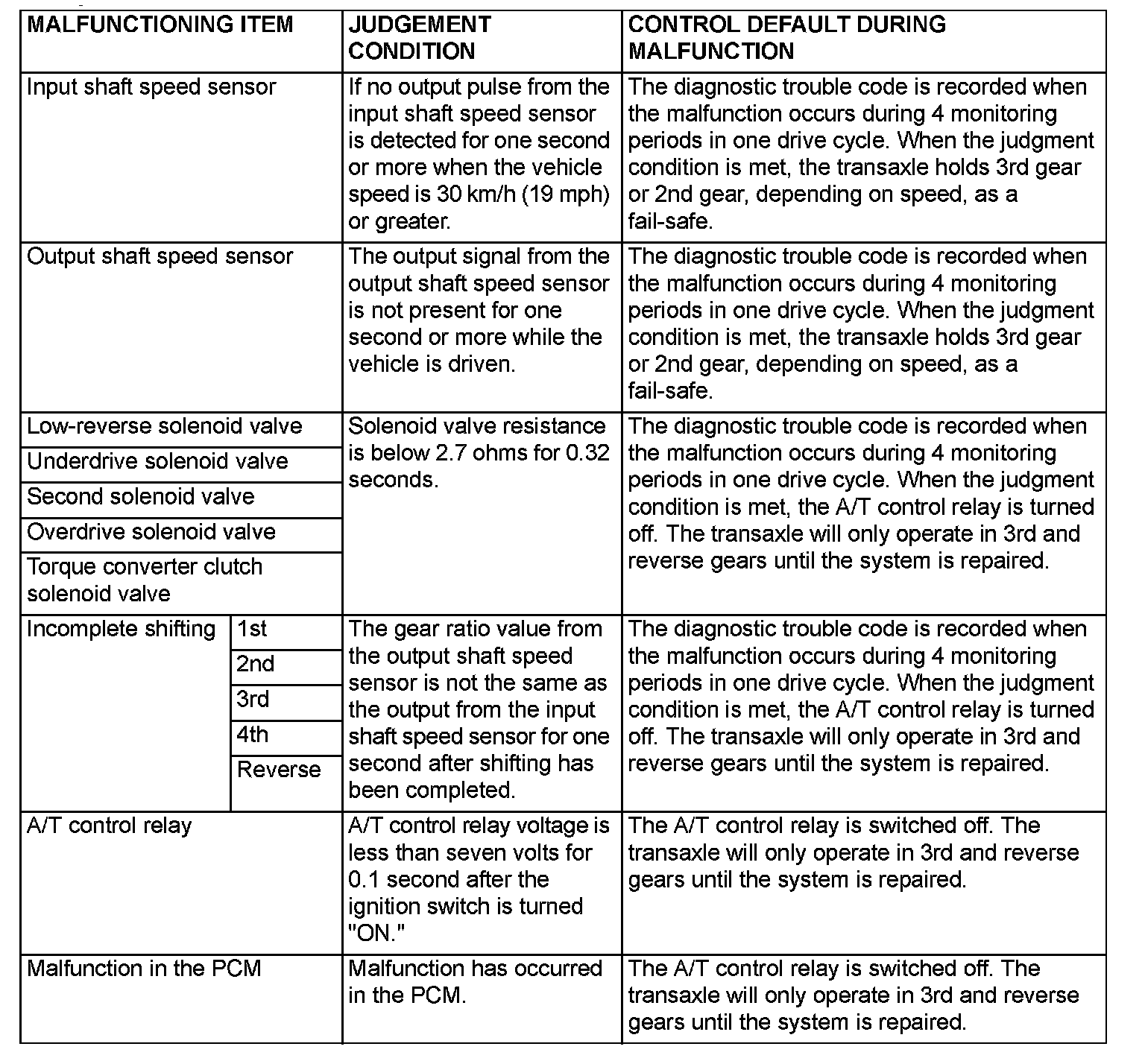 When a malfunction of a main sensor or actuator is detected by the PCM, the transaxle is controlled by pre-set control logic to maintain safe conditions for driving.