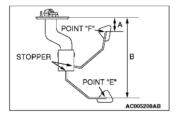 Fuel Level Sensor Float Height1. Move the float and measure height A at point "F" (highest) and B at point "E" (lowest) with the float arm touching stopper.