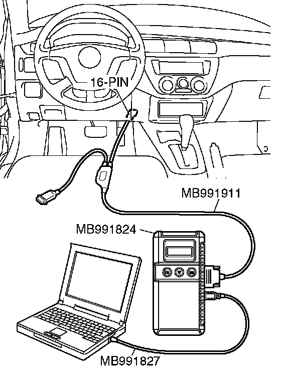 CAUTION: To prevent damage to scan tool MB991958, always turn the ignition switch to the LOCK (OFF) position before connecting or disconnecting scan tool MB991958.