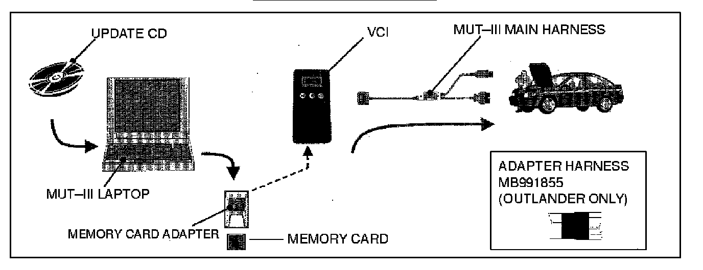 8. When the memory card data transfer is complete, remove the memory card from the laptop and install it in the VCI. Connect the VCI to the vehicle, using the RED CABLE. Be sure to connect both the 12-pin and 16-pin connectors securely. (On Outlander models, adapter harness MB991855 is required.) YOU MUST DISCONNECT THE MUT-III LAPTOP.