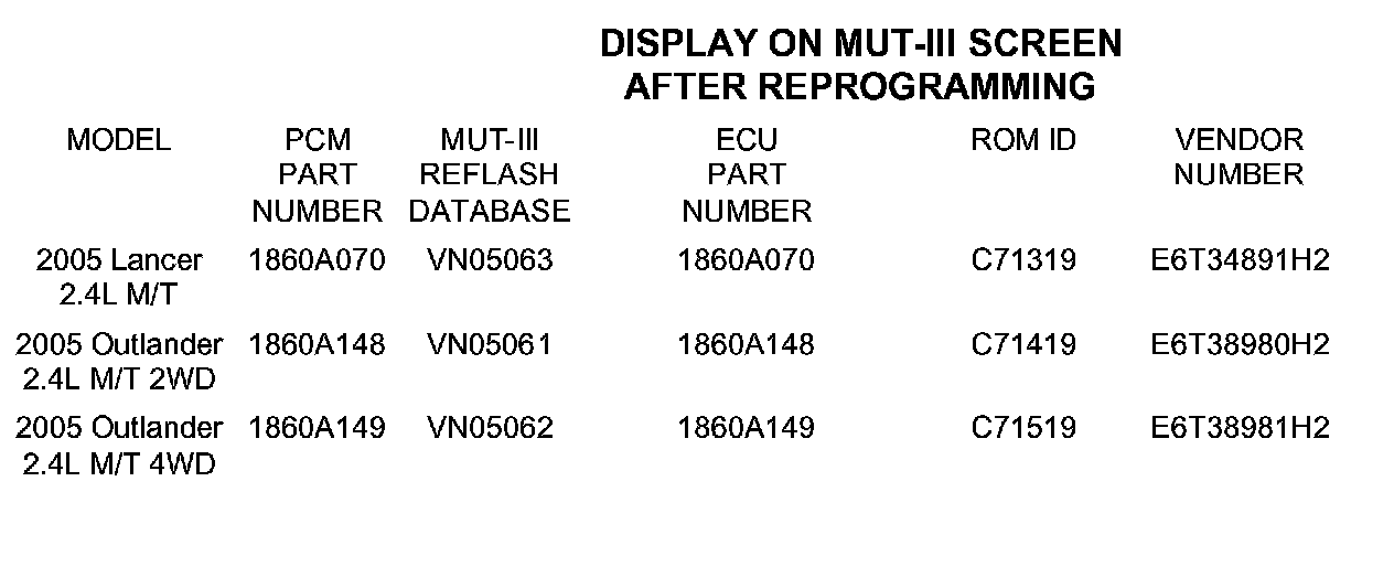Home >> Mitsubishi >> 2005 >> Lancer L4-2.4L SOHC >> Repair and Diagnosis >> Powertrain Management >> PROM - Programmable Read Only Memory >> Technical Service Bulletins >> Recalls >> Recall - PCM Reprograming for VSS/OBD Concerns >> Repair Procedure