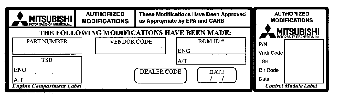 10. Using a ball-point pen, enter the appropriate PCM part number, vendor number, ROM ID#, this recall bulletin number (EMR-05-002), your dealer code, and the current date on the Engine Compartment / Control Module Label (p/n MSSF-024G-00).