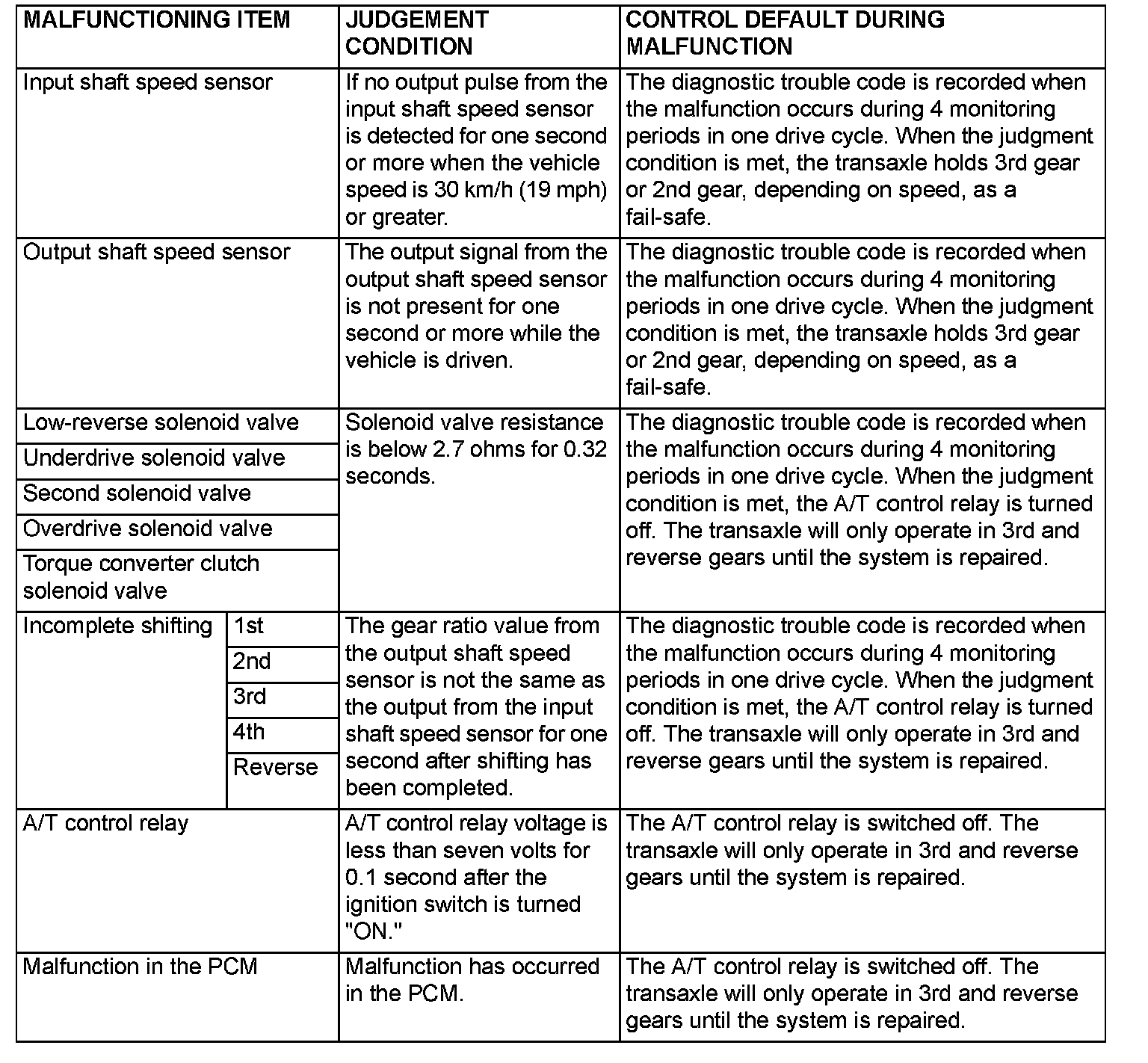 When a malfunction of a main sensor or actuator is detected by the PCM, the transaxle is controlled by pre-set control logic to maintain safe conditions for driving.