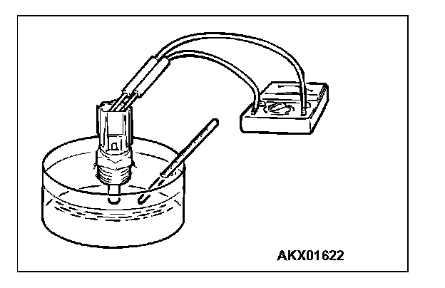 2. With the temperature sensing portion of engine coolant temperature sensor immersed in hot water, check the resistance.