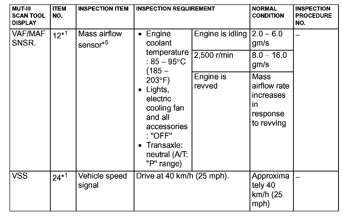NOTE: *5: In a new vehicle [driven approximately 500 km (311 mile) or less], the mass airflow sensor output value is sometimes 10% higher than the standard value.