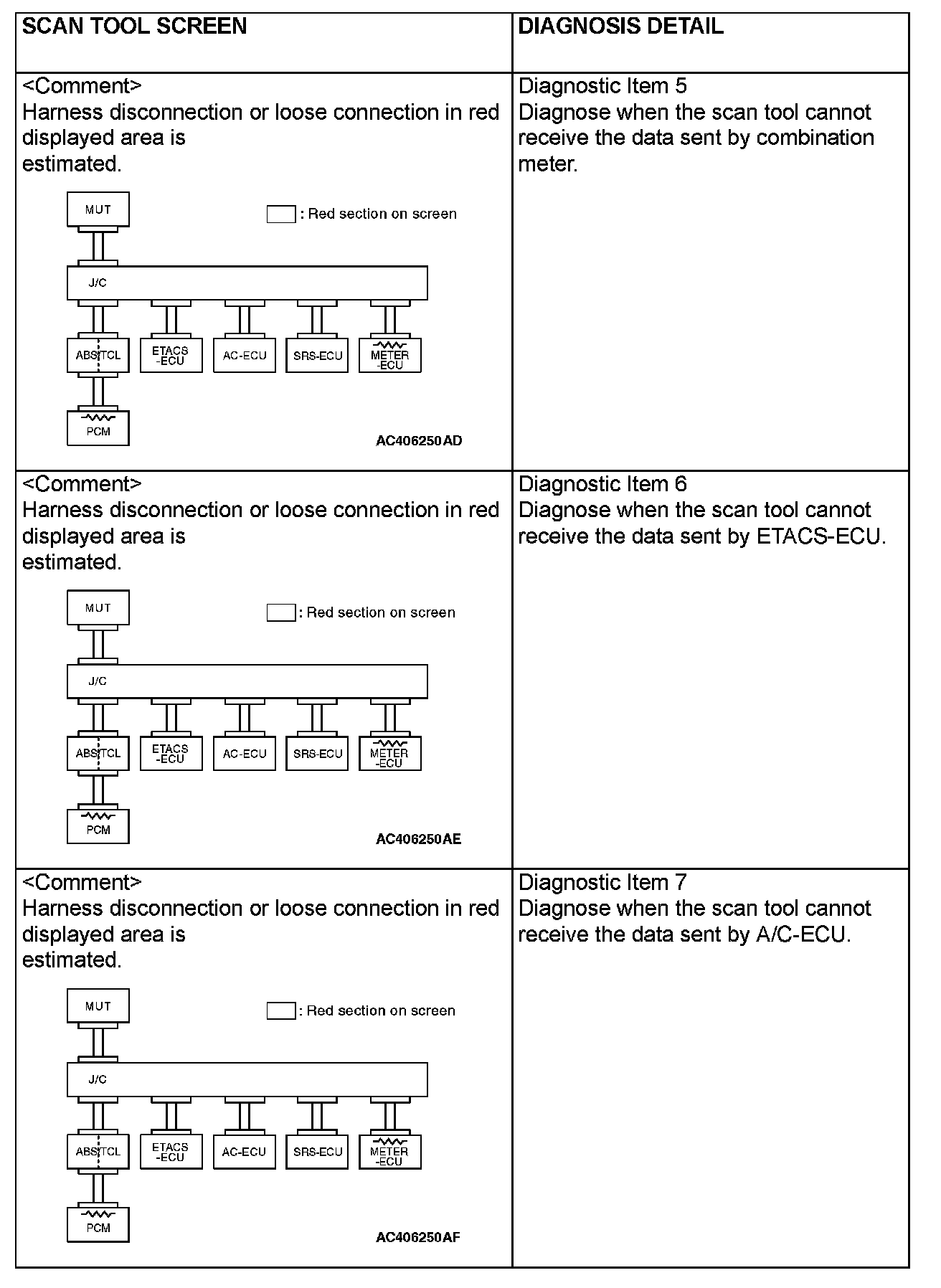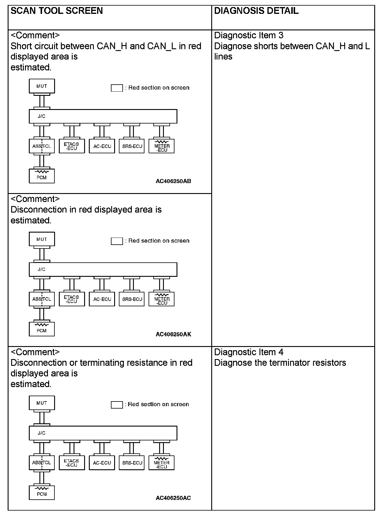 NOTE: If the screen other than above is displayed, troubles are present at two or more spots. In this case, diagnose CAN bus lines by referring to the trouble spot pinpoint procedures.