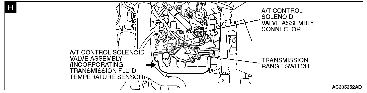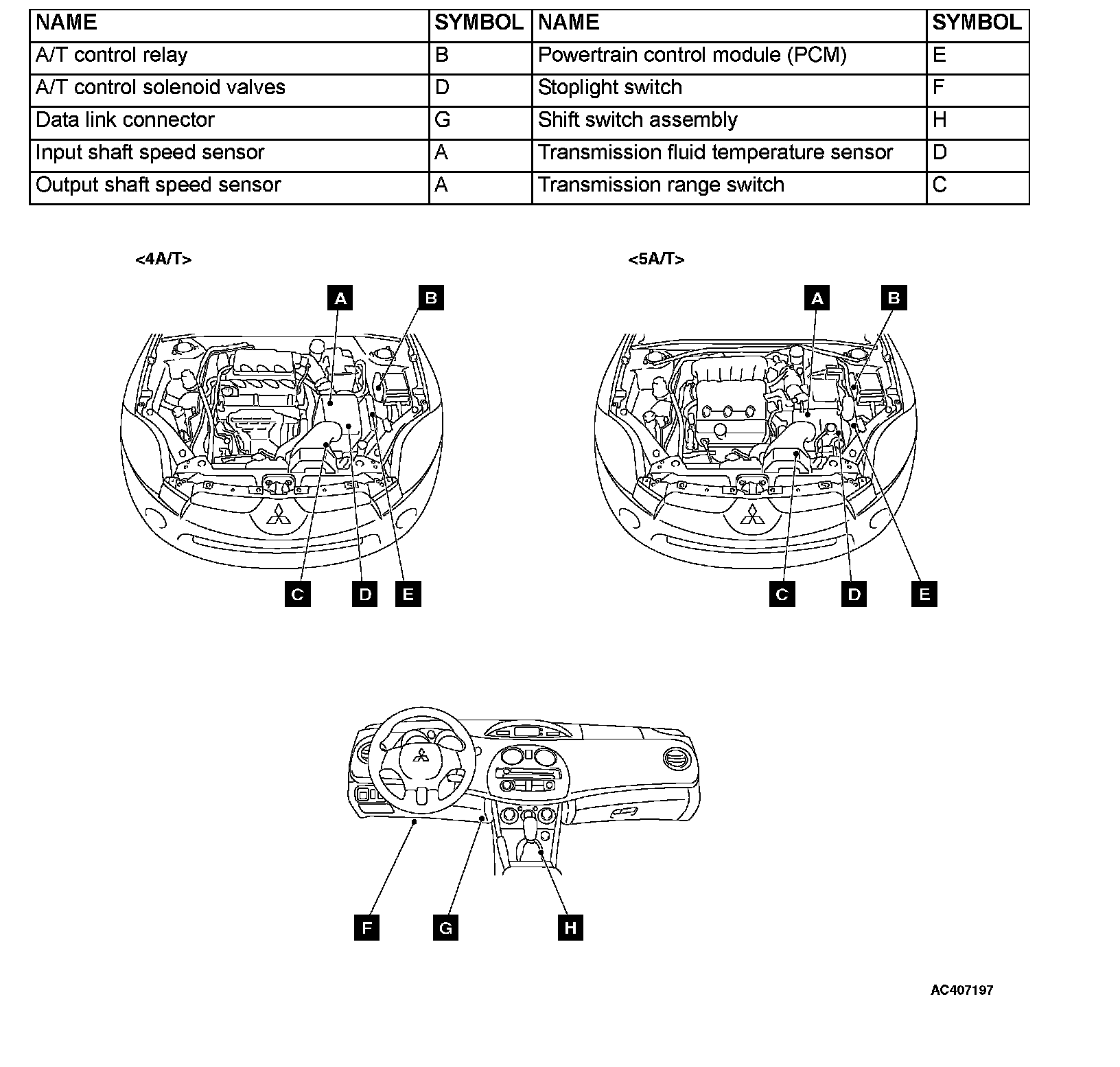 A/T CONTROL COMPONENT LAYOUT / SYMBOLS A-H: