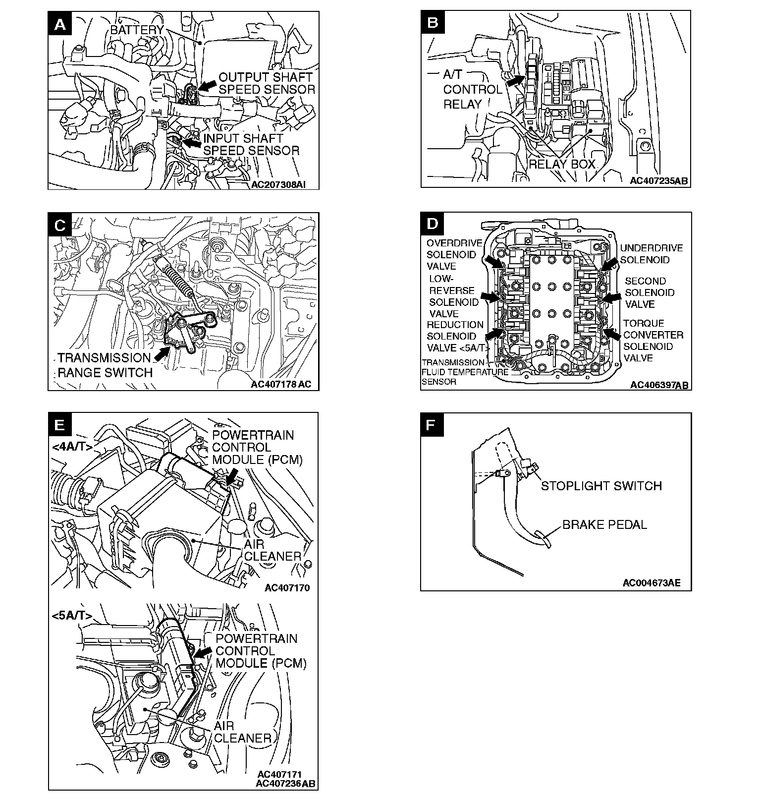 A/T CONTROL COMPONENT LAYOUT / SYMBOLS A-F: