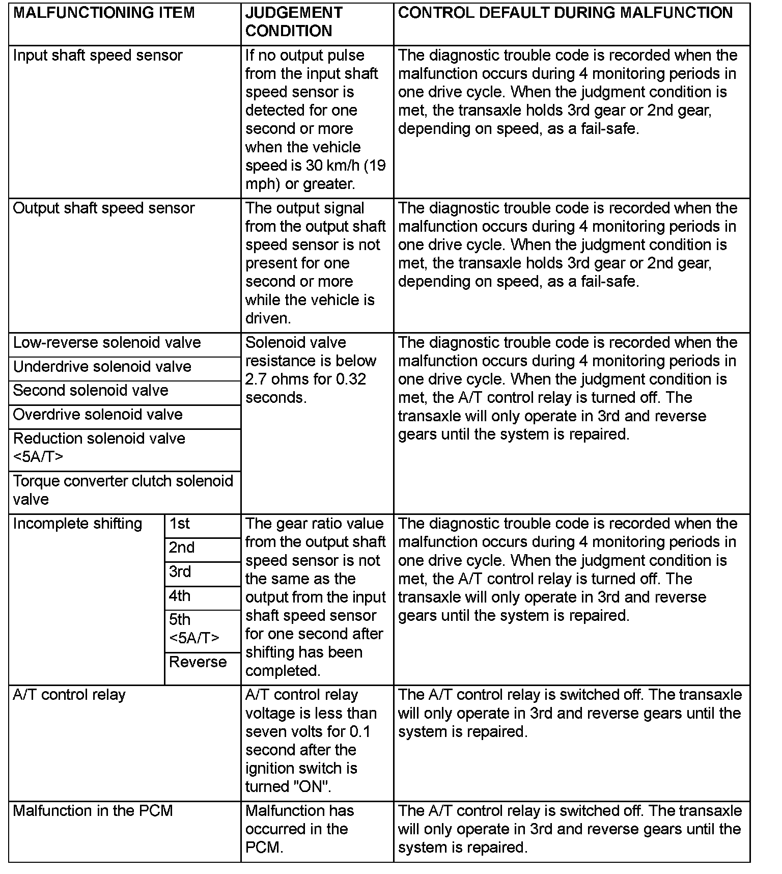 FAIL-SAFE/BACKUP FUNCTIONWhen a malfunction of a main sensor or actuator is detected by the PCM, the transaxle is controlled by pre-set control logic to maintain safe conditions for driving.