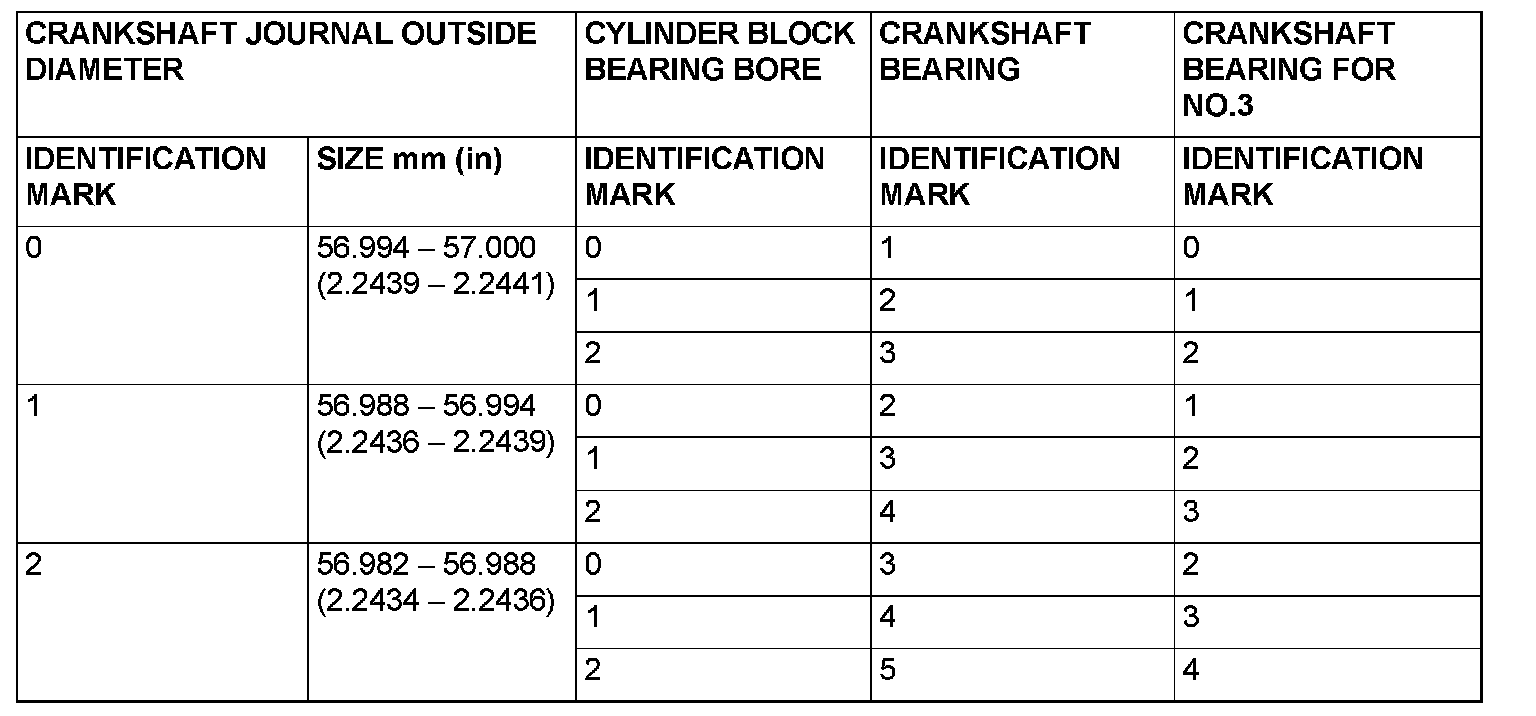 For example, if the crankshaft journal outside diameter identification mark is "0" and cylinder block bearing bore identification mark is "1," select a bearing whose identification mark is "2" for number 1, 2, 4 and 5, and a bearing whose identification mark is "1" for number 3.