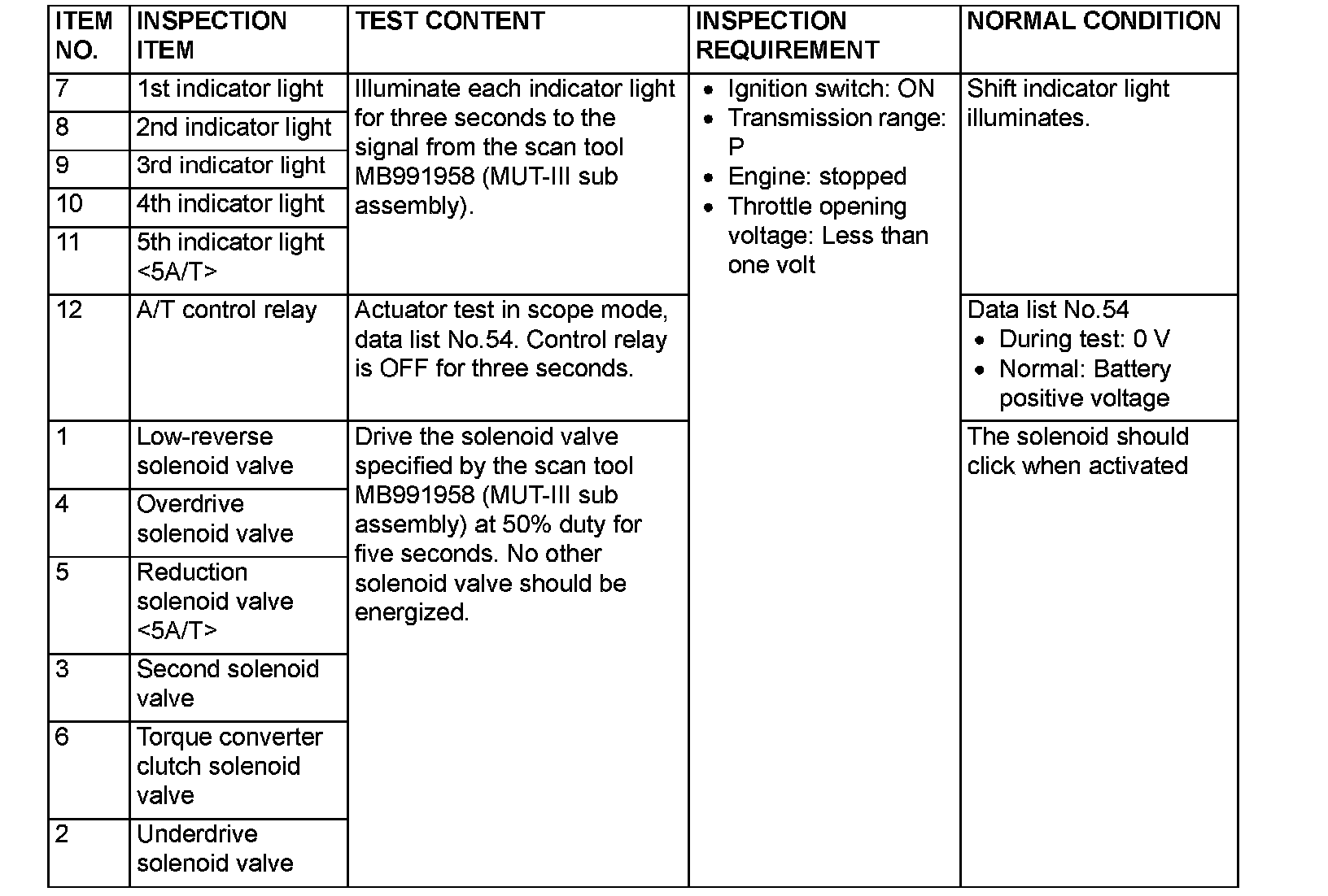 ACTUATOR TEST REFERENCE TABLE: