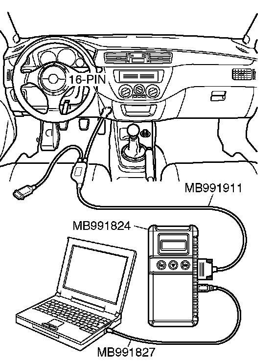 CAUTION: To prevent damage to scan tool MB991958, always turn the ignition switch to the "LOCK" (OFF) position before connecting or disconnecting scan tool MB991958.