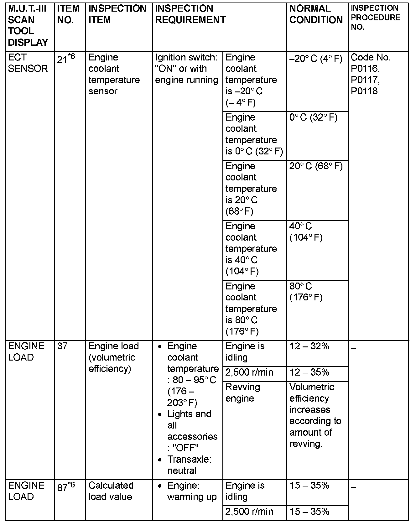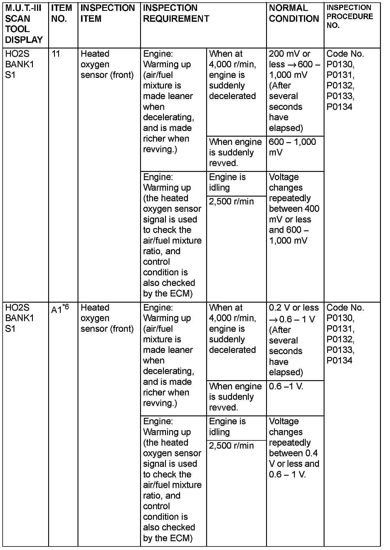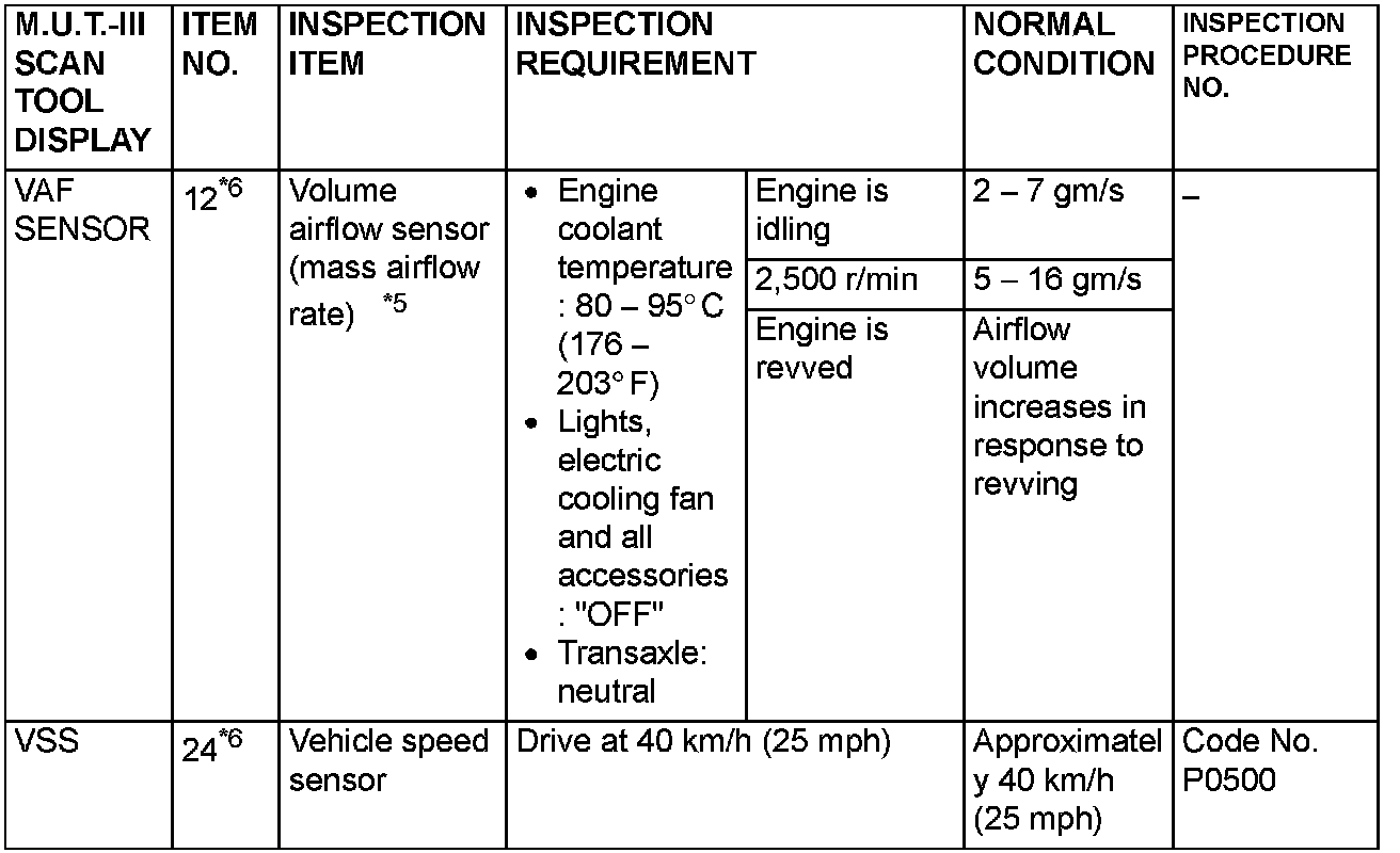 NOTE: *6: GST items. [Data list items consist of M.U.T.-III items and GST items. GST items can be accessed through the use of a general scan tool (GST). When scan tool MB991958 (M.U.T.-III sub assembly) is used, M.U.T.-III items appear alphabetically; then, GST items appear alphabetically. The black and white characters of the GST items are inverted from the M.U.T.-III items.]