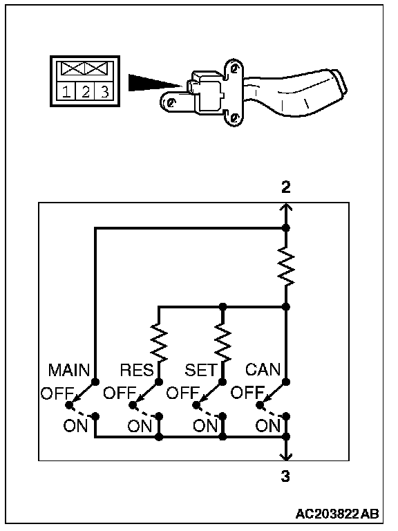 Home >> Mitsubishi >> 2006 >> Lancer L4-2.4L SOHC >> Repair and Diagnosis >> Cruise Control >> Cruise Control Switch >> Testing and Inspection >> Auto-Cruise Control Switch Check