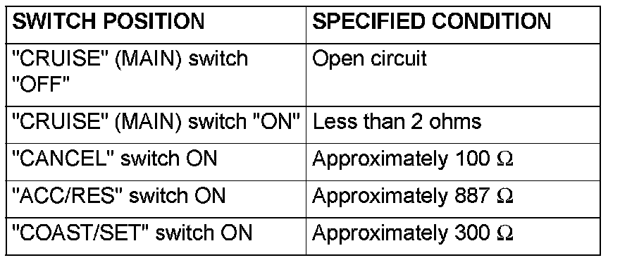 2. Measure the resistance between terminal 2 and terminal 3 when each of the "COAST/SET", "ACC/RES", "CANCEL" and "CRUISE" (MAIN) switches is pressed. If the values measured at the time correspond to those in the table, the resistance values are correct.