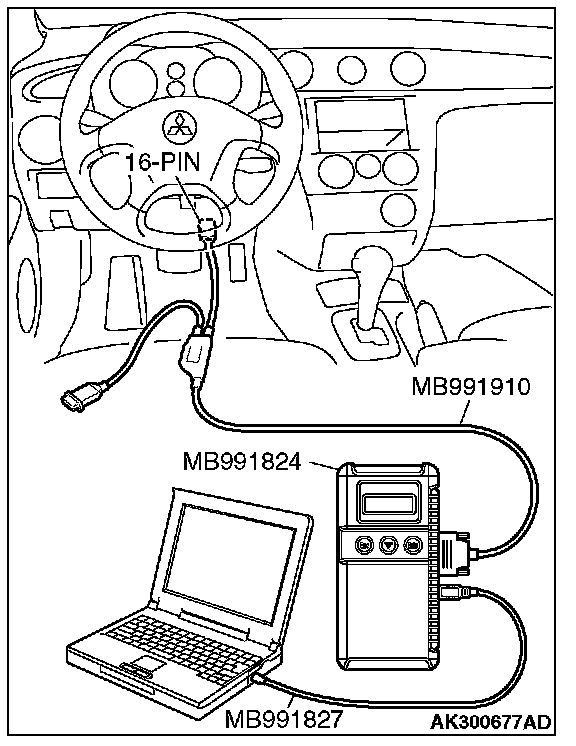 CAUTION: To prevent damage to scan tool MB991958, always turn the ignition switch to the "LOCK" (OFF) position before connecting or disconnecting scan tool MB991958.