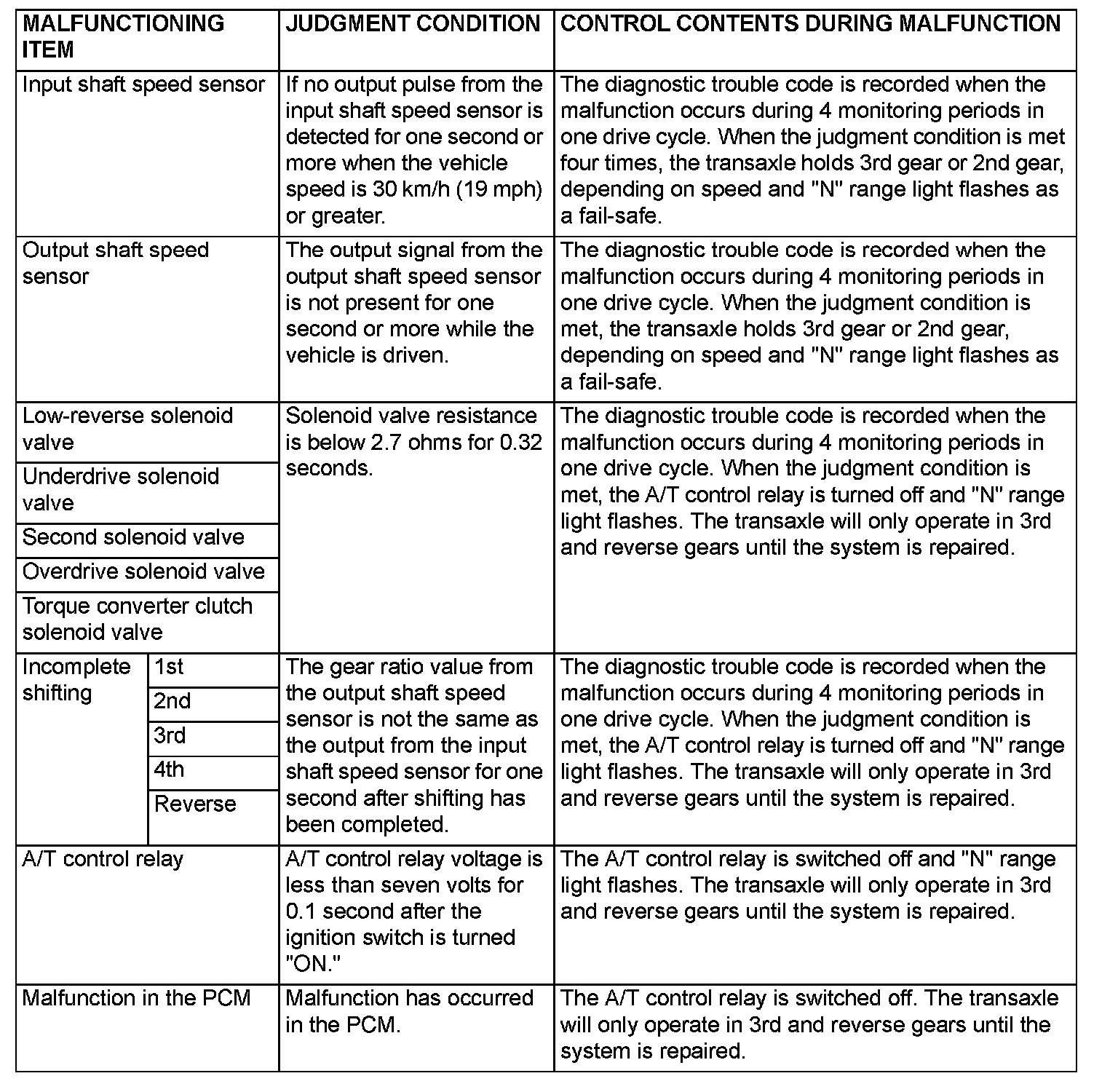 When a malfunction of a main sensor or actuator is detected by the PCM, the transaxle is controlled by pre-set control logic to maintain safe conditions for driving.
