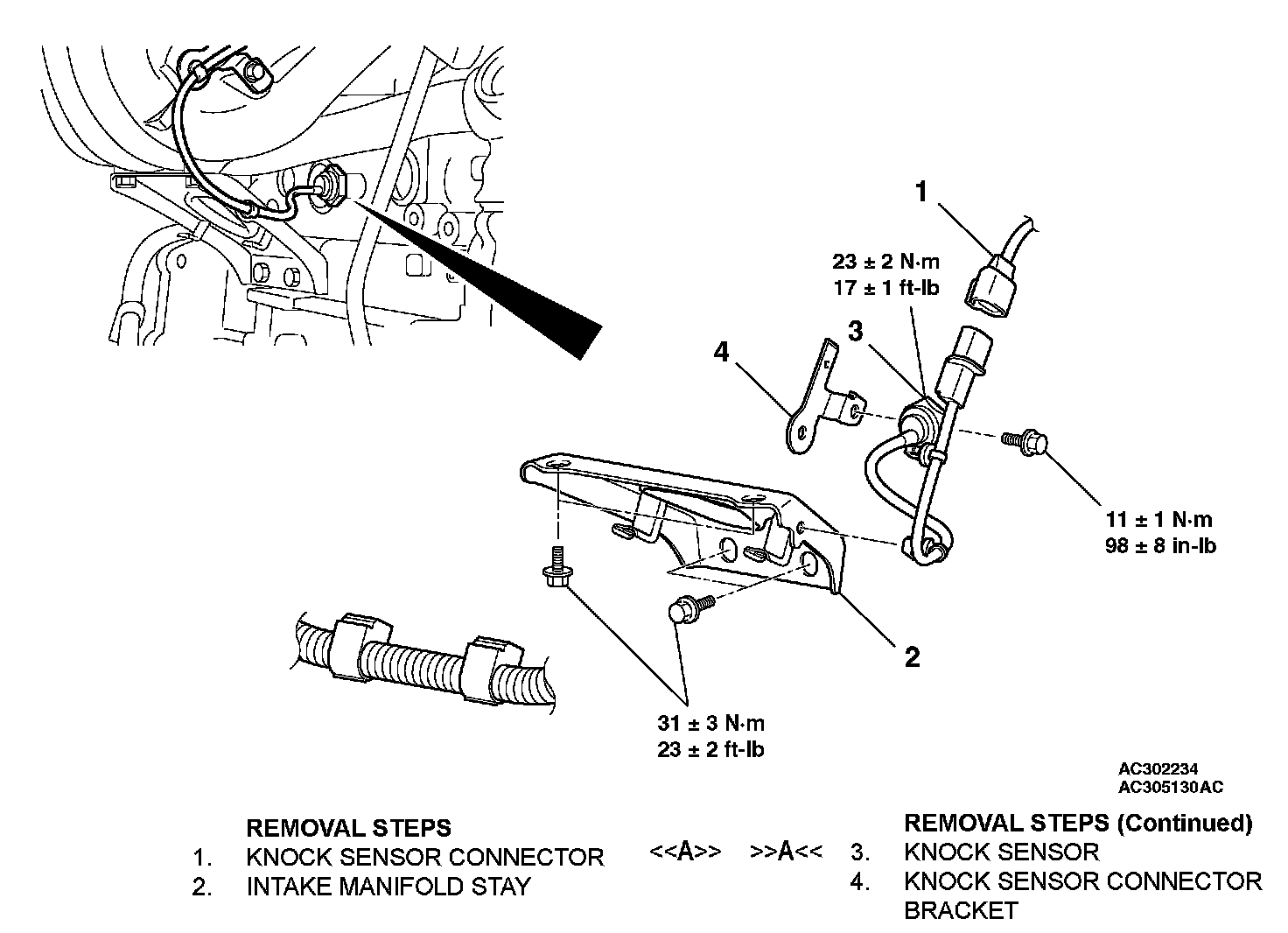 CAUTION: When the knock sensor replacement is performed, use scan tool MB991958 to initialize the learning value. (Refer to Initialization Procedure for Learning Value in MFI Engine).