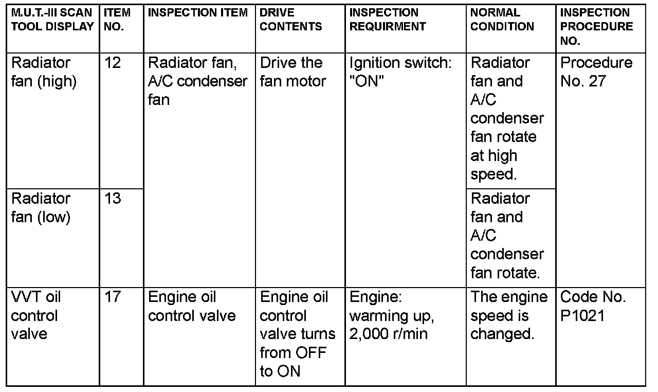 Actuator Test Reference Table