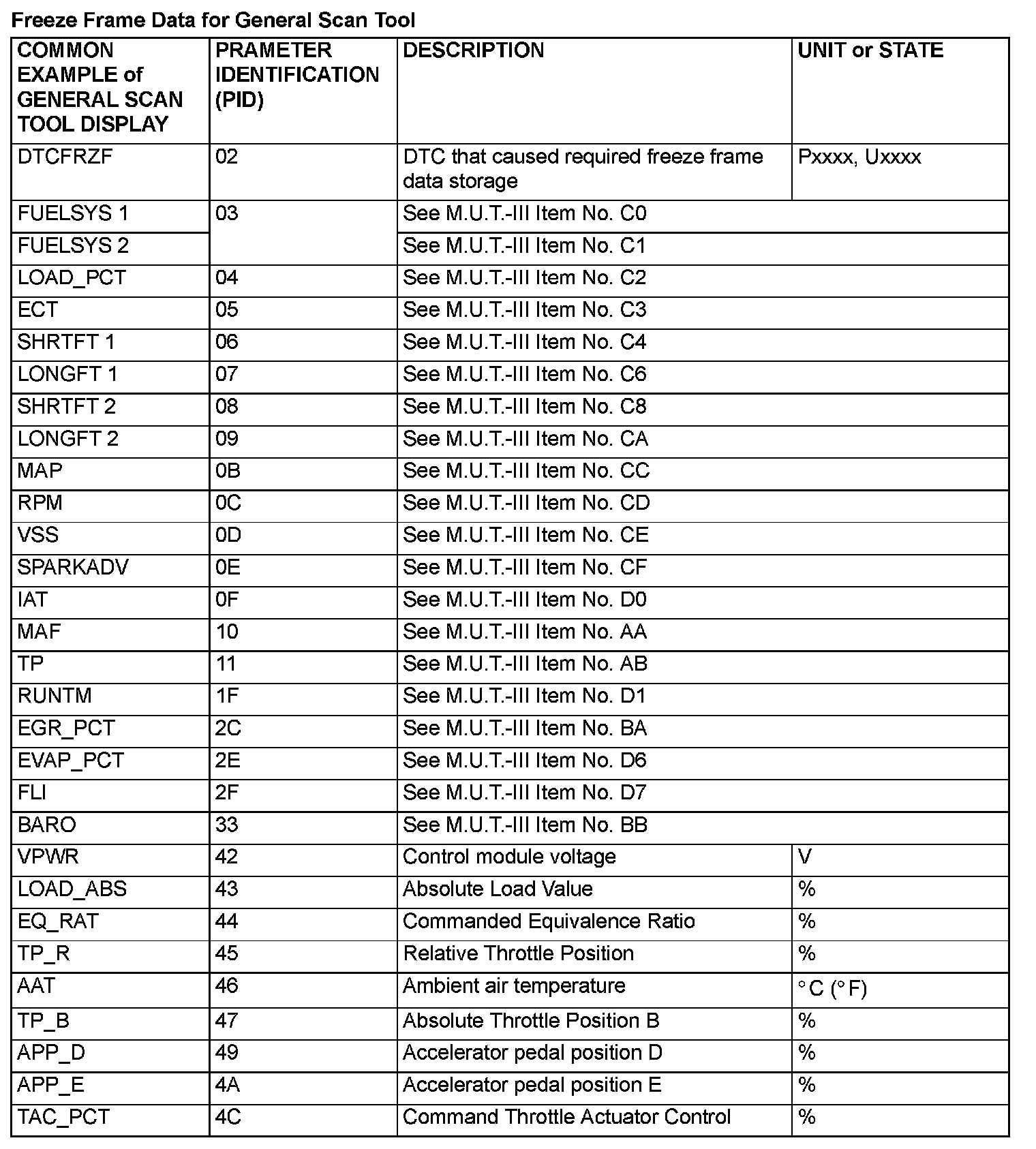Freeze Frame Data For General Scan Tool: