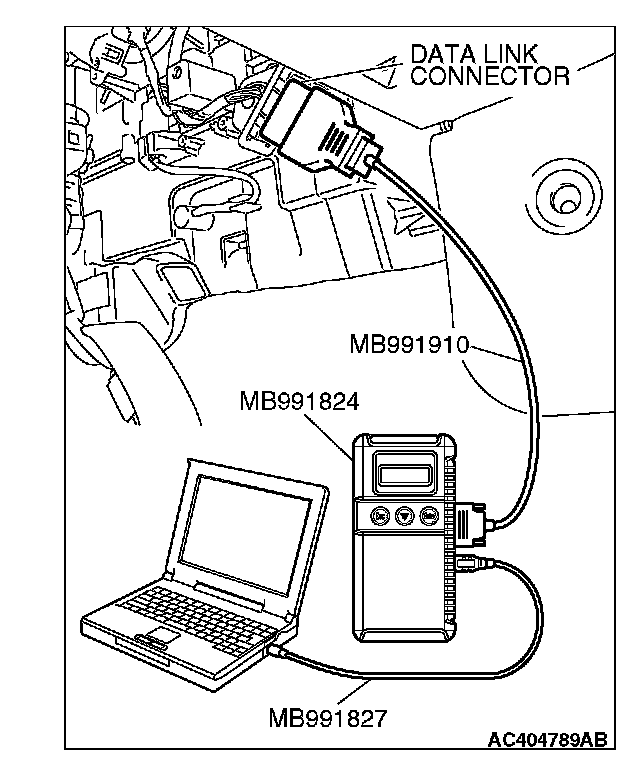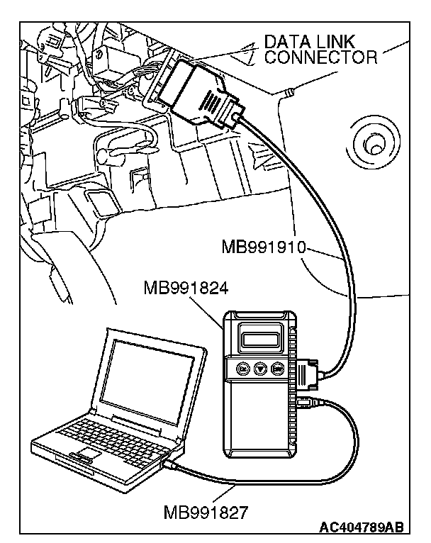 CAUTION: To prevent damage to scan tool MB991958, always turn the ignition switch to the "LOCK" (OFF) position before connecting or disconnecting scan tool MB991958.