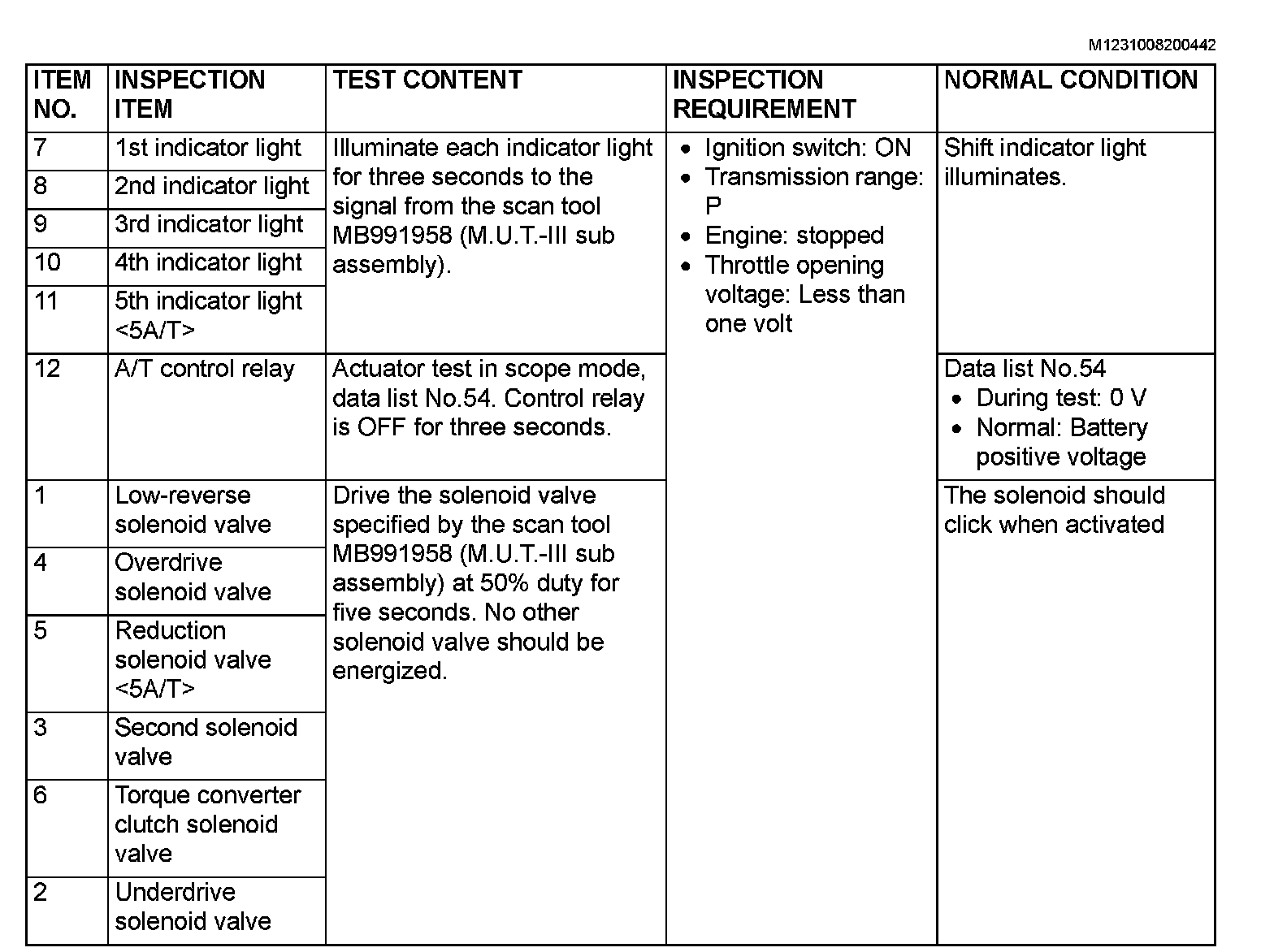 ACTUATOR TEST REFERENCE TABLE: