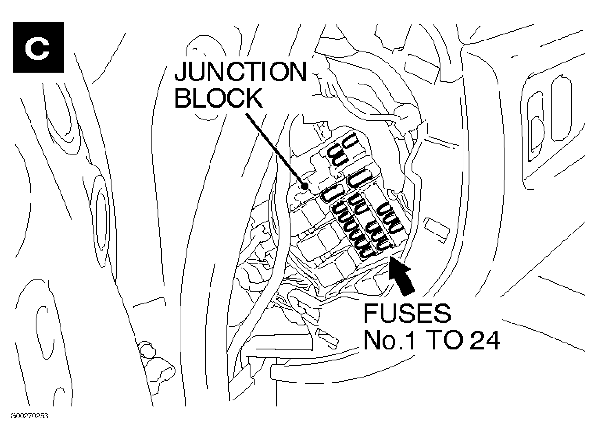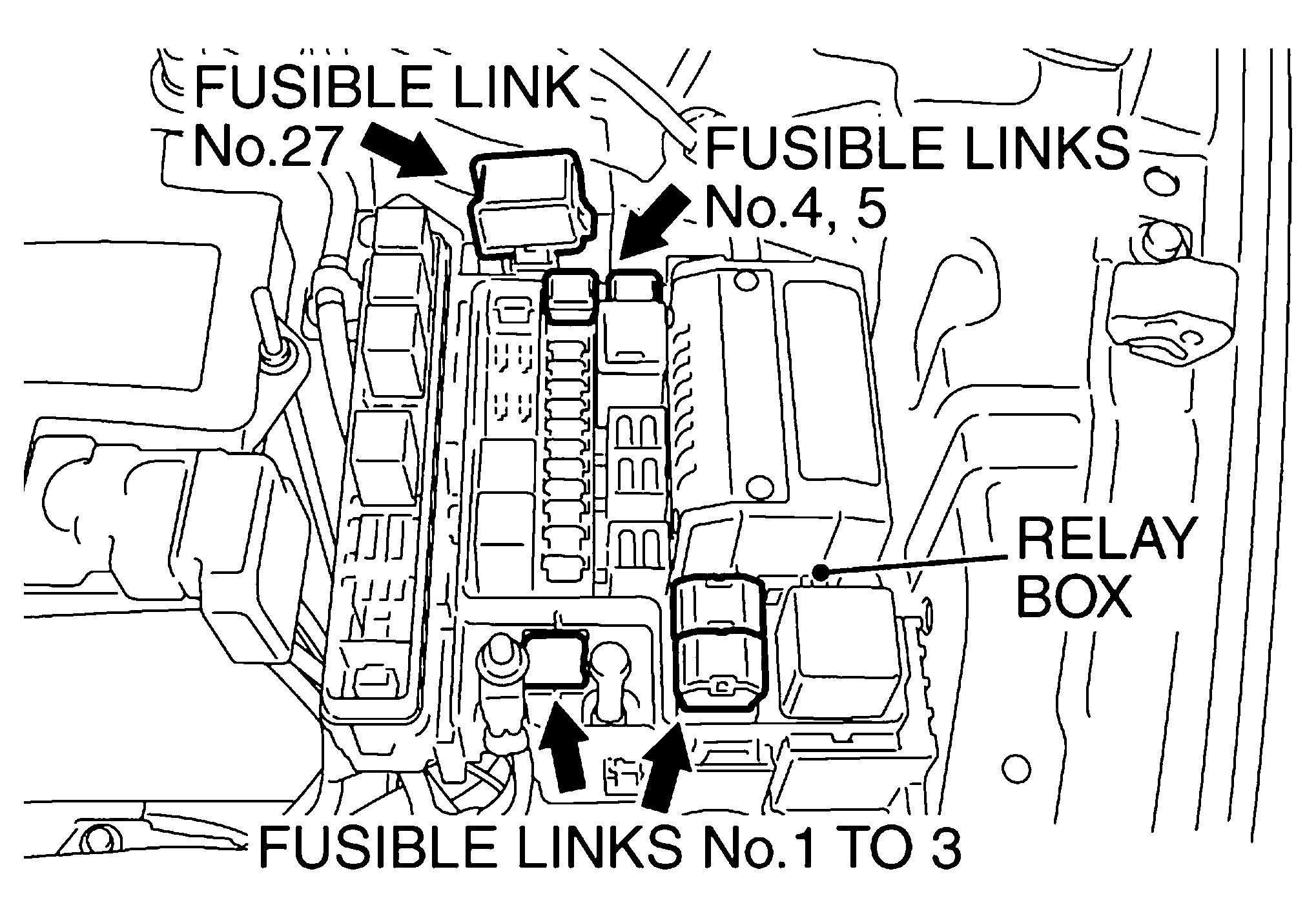 | Fusible Links No. 1 - 5 & 27 | On engine compartment relay box. See Figure. |
