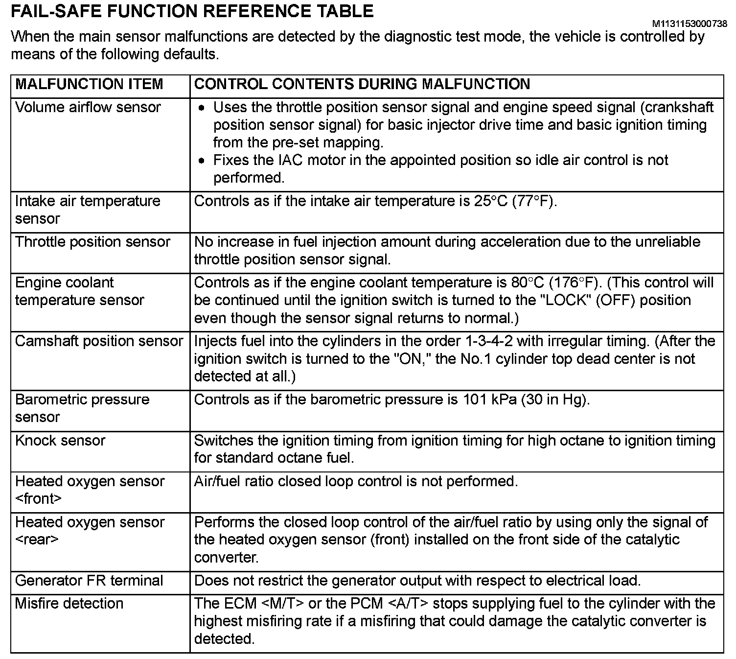 When the main sensor malfunctions are detected by the diagnostic test mode, the vehicle is controlled by means of the following defaults.