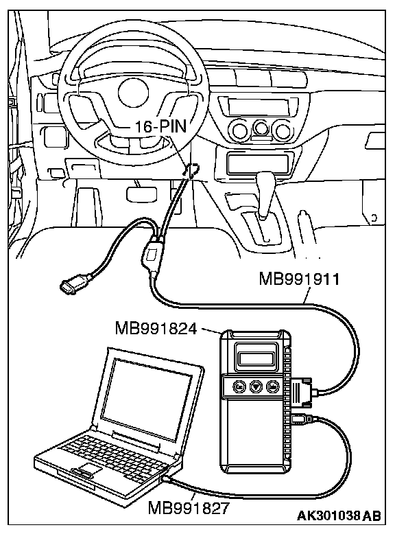 CAUTION: To prevent damage to scan tool MB991958, always turn the ignition switch to the "LOCK" (OFF) position before connecting or disconnecting scan tool MB991958.