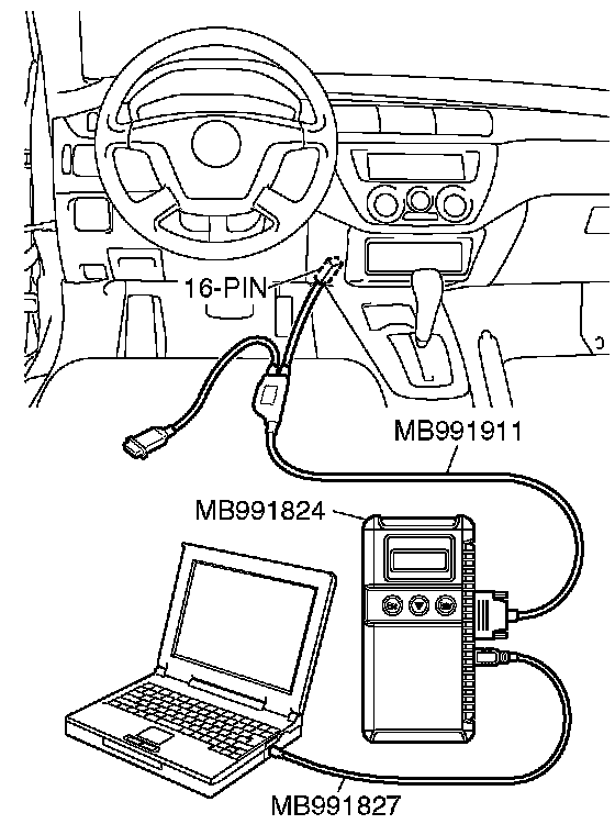 CAUTION: To prevent damage to scan tool MB991958, always turn the ignition switch to the "LOCK" (OFF) position before connecting or disconnecting scan tool MB991958.
