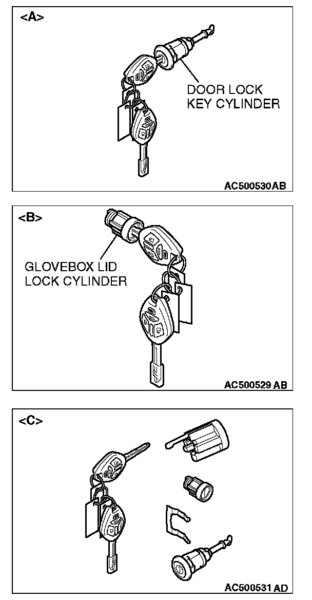 - Do not register the ignition keys other than the ignition key that starts the engine. (When replacing by the door lock key cylinder of illustration [A] or the glove box lid lock cylinder of illustration [B], the engine cannot start if the encrypted code is registered with the bar code on the ignition key supplied simultaneously. If the ignition key using for each lock cylinder and starting engine is used as a common ignition key, replace by the key set of illustration [C].)