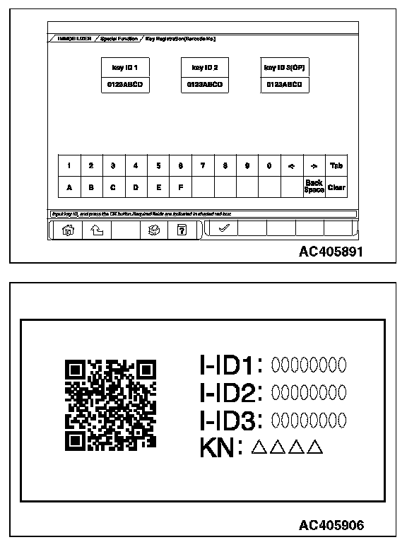 ENCRYPTED CODE REGISTRATION USING BARCODE NO.When the ignition key that starts the engine is replaced due to the replacement of the ignition key set, the ignition key cylinder, etc., the barcode No. must be used to register encrypted codes.