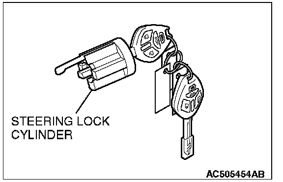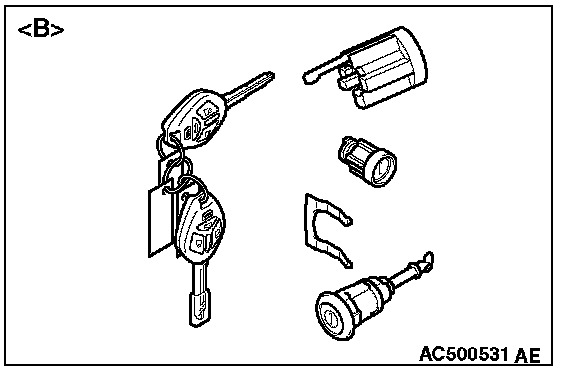 - When adding the ignition key separately, or replacing the components by the steering lock cylinder of illustration [A] (the ignition key is simultaneously supplied) or the key set of illustration [B], register the encrypted code.Refer to chassis electrical, Encrypted Code Registration Criteria Table.