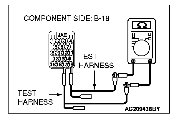 1. Disconnect ECM [M/T] or PCM [A/T] connector B-18, and measure the resistance at the component side of ECM [M/T] or PCM [A/T] connector B-18.